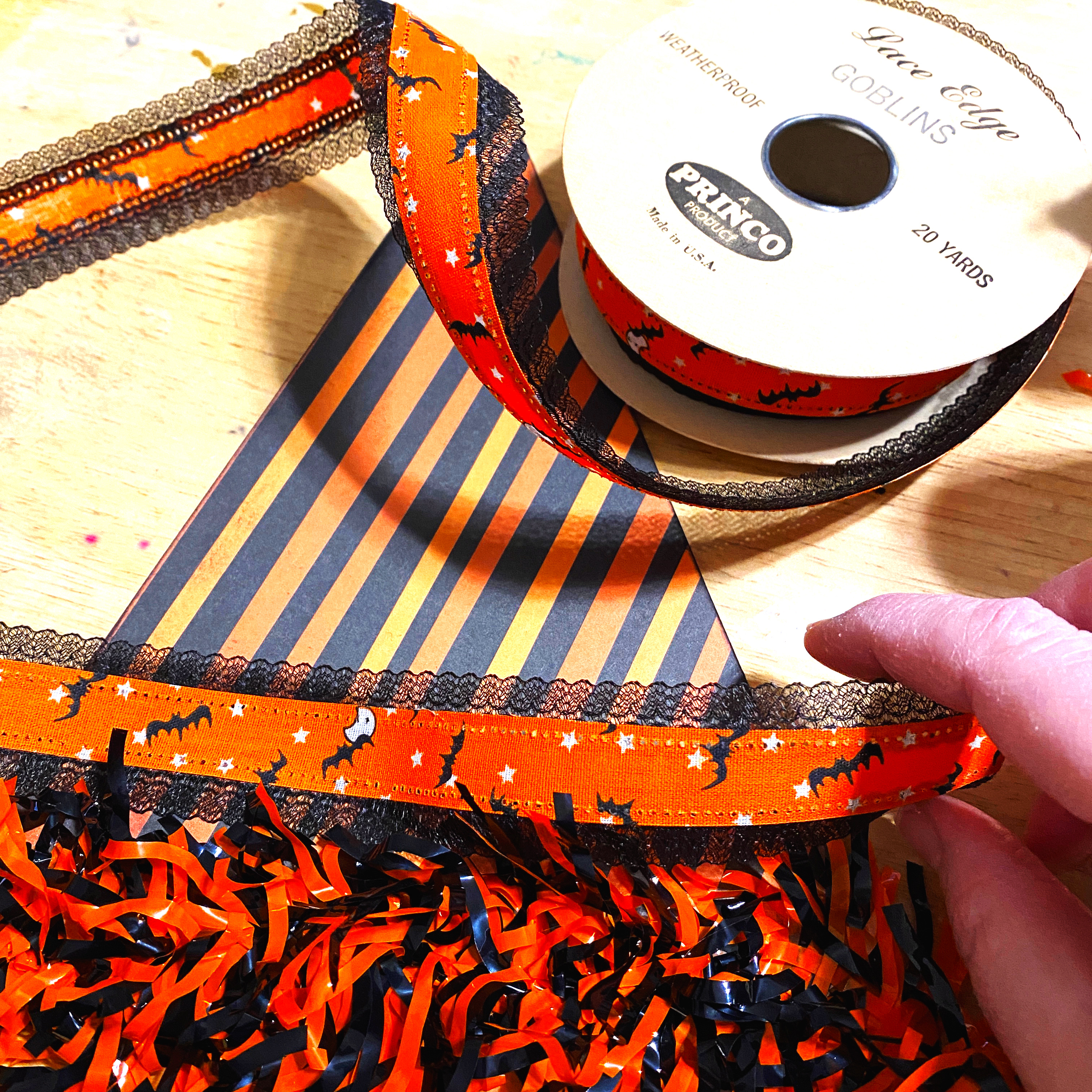 I had some vintage cotton ribbon that I purchased at an estate sale that I wanted to use as the band on the hat. I love finding and collecting vintage items to use on my altered projects, but any contrasting ribbon will do…