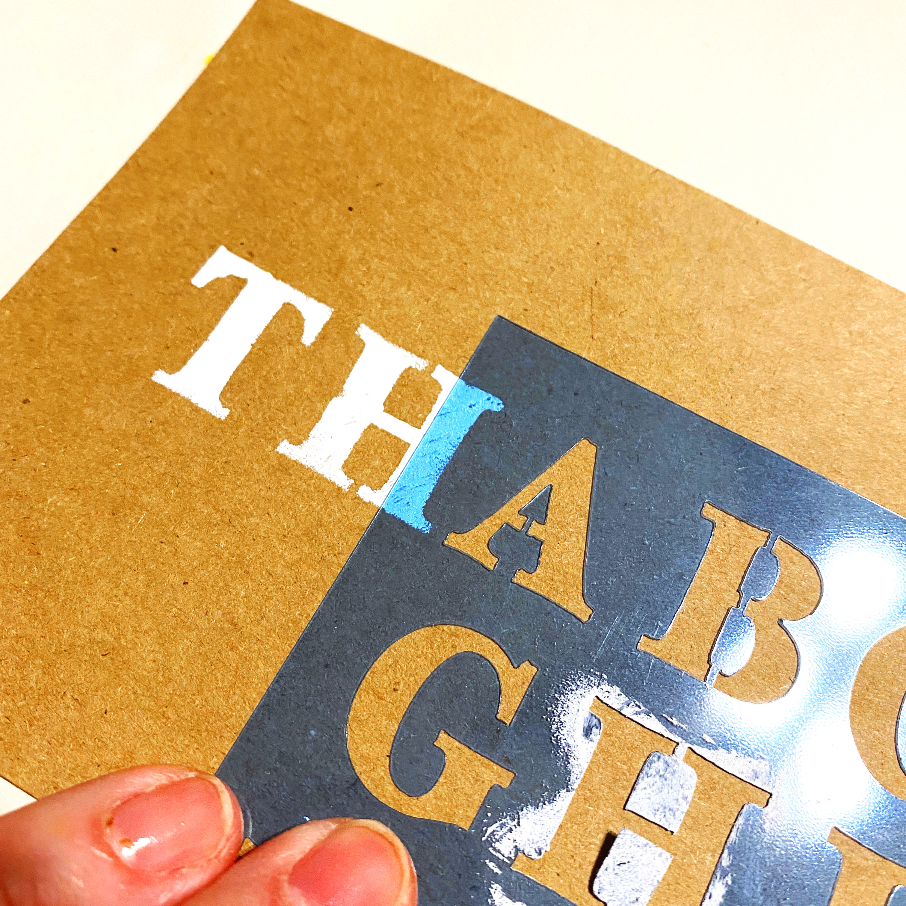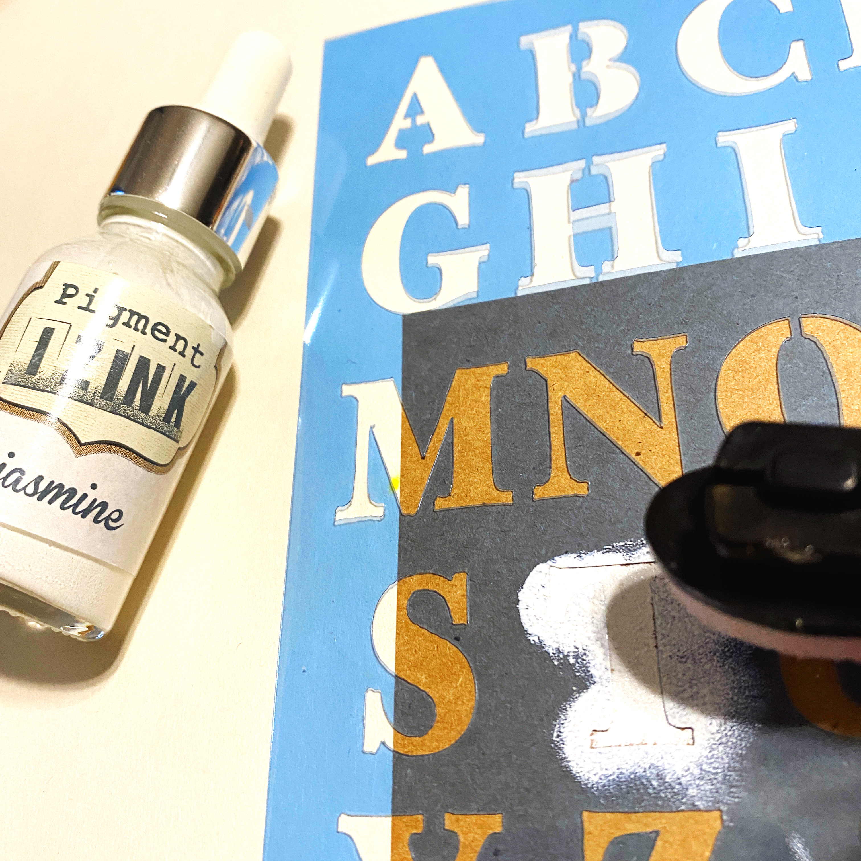 You need to work one letter at a time, and let it dry before moving on to the next one. The Izink dries quickly, but this would be a good time to work assembly line style if you need multiples, just add each letter to each card front. You can see where to put the next letter as it's easy to line up through the see-thru stencil…