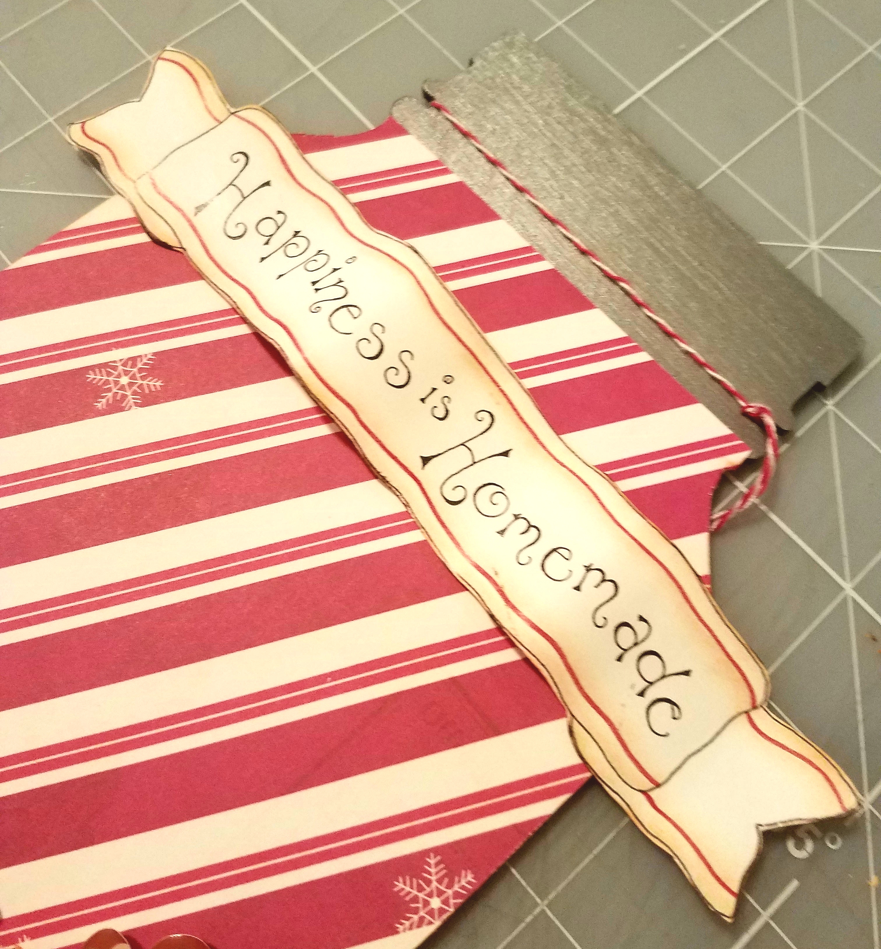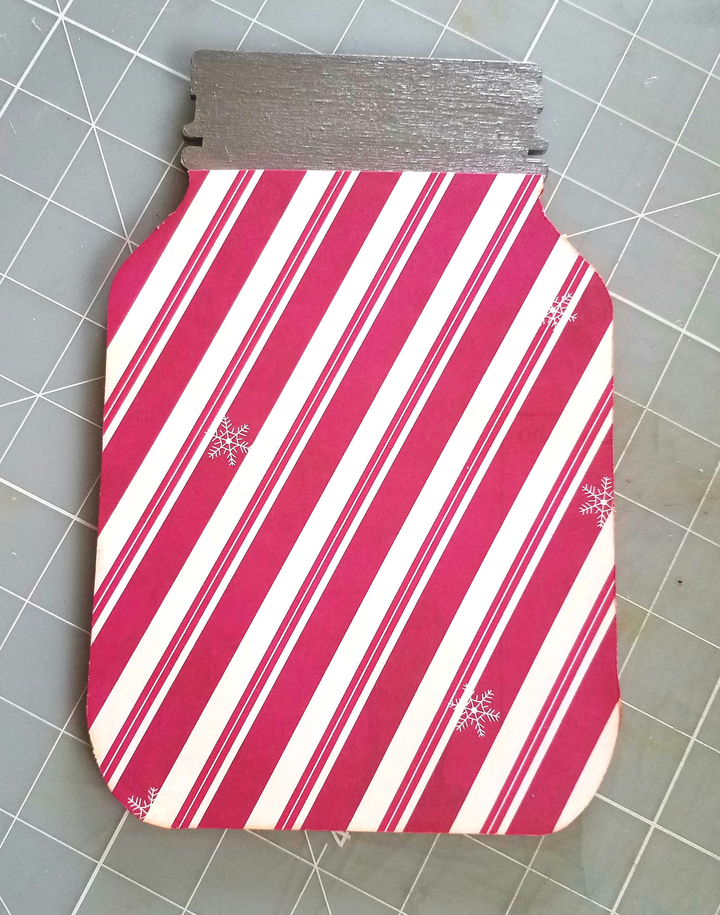 Then I choose a candy cane striped paper and traced the mason jar shape onto my paper with a pencil. Cut it out and take some craft glue and adhere your paper to the front portion of your mason jar shape. I prefer to use Beacon 3 in 1 Glue, it has a strong hold and dries clear. I trimmed any excess paper around the edge of my jar with an exacto knife. Using a distress tool, smooth the edges around your jar.