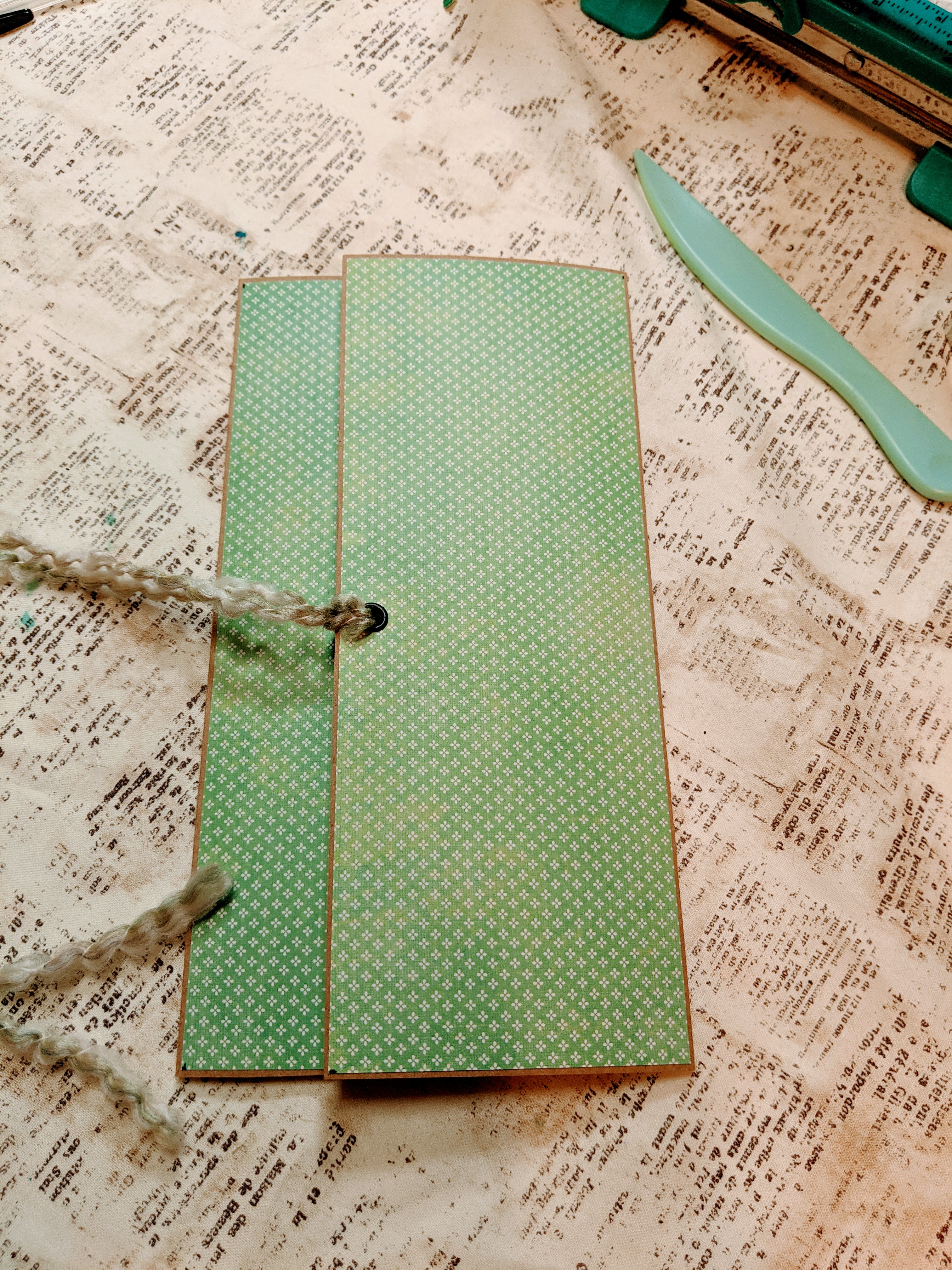 This next step is pretty easy. I just used my crop-a-dile and punched a hole on the outside fold. Inserted an eyelet and with the crop-a -dile again secured it in place. Then, I took some yard of winter colors and strung it through the hole.