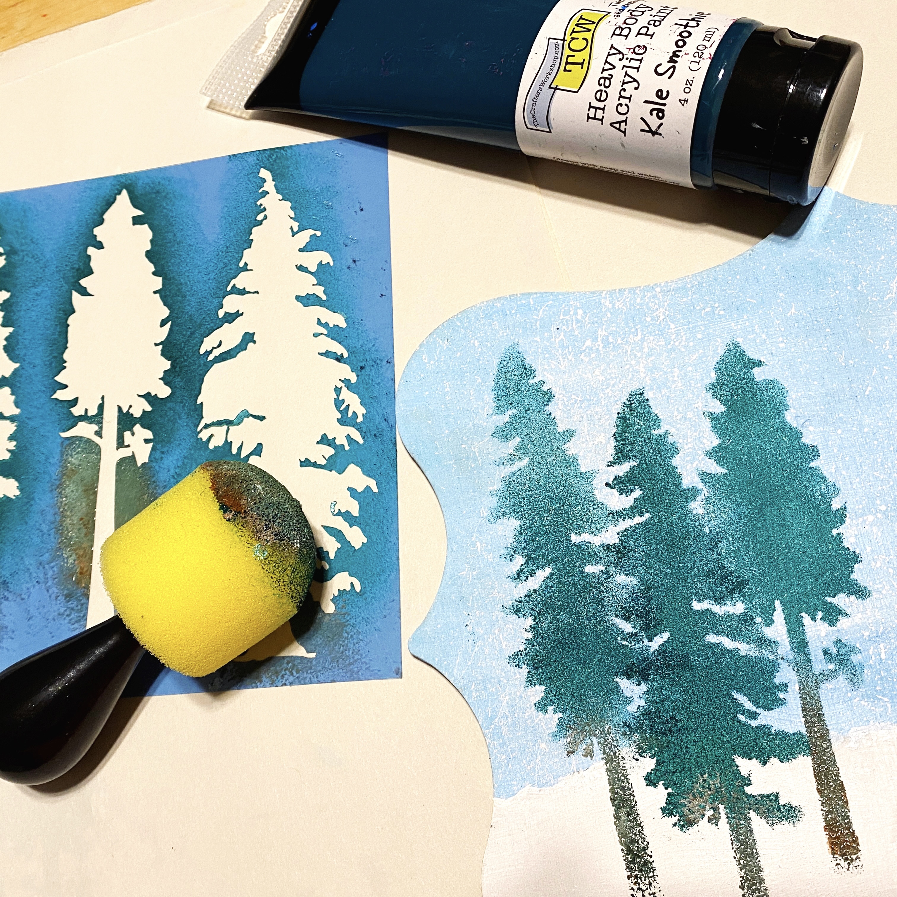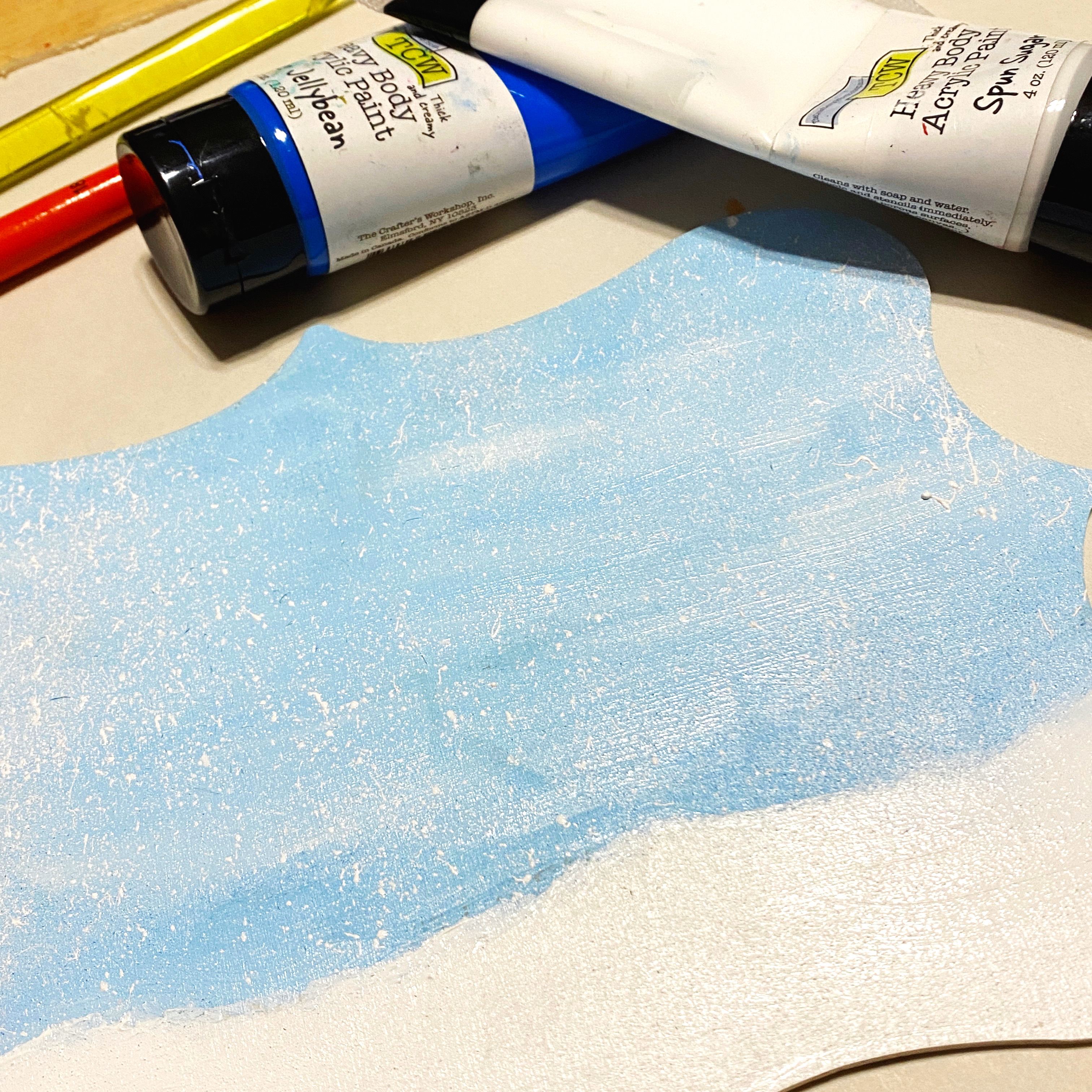 First, I painted a Deco Wood Shape with sky blue at the top and white along the bottom. I added white specks using a splatterbrush to add snow to the sky…