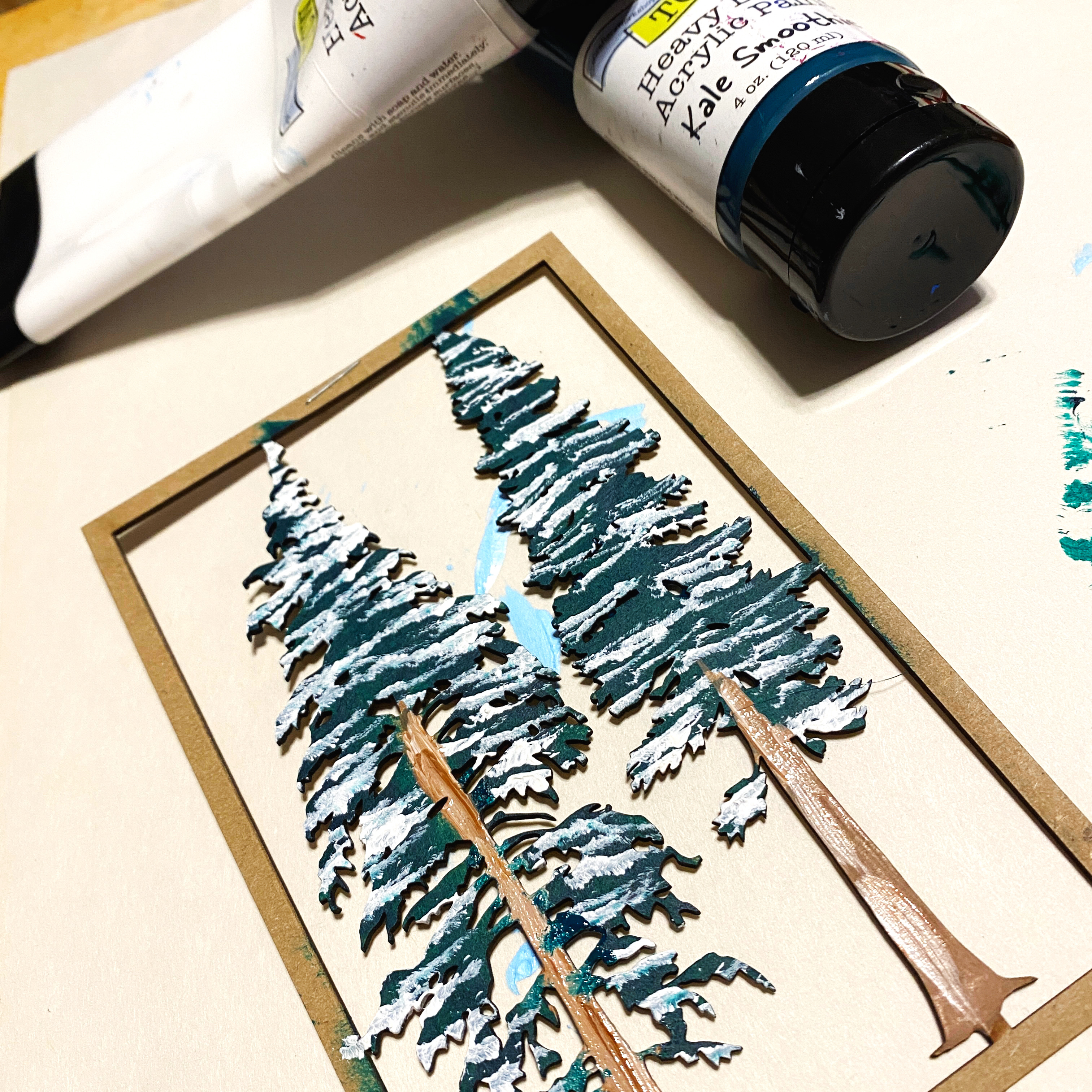 While that dried; I painted the Pine Tree Chipboard Embellishments. I found it easier to paint them while they were still in their frame, so I had something to hold onto. Then cut them apart from it after they had dried. I painted the trees green, then used a flat brush to add "lines" of white to mimic snow on the bows. The trunks were painted brown…