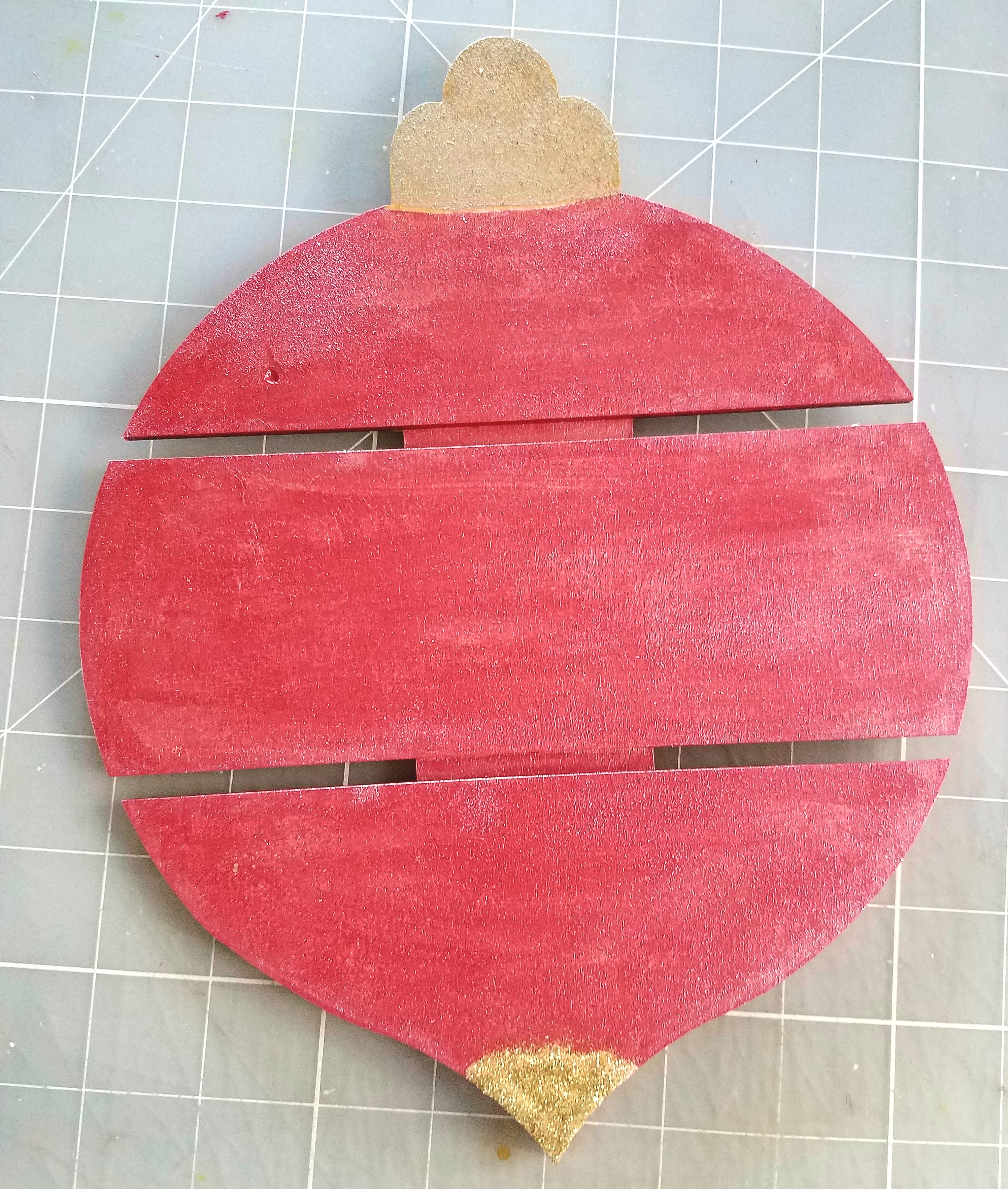 Step one: paint your wood pallet bulb base using metallic red paint. Dont forget to pain the sides of your pallet shape too. Then apply gold metallic acrylic paint to the top of the bulb shape. Let dry. You may have to add 2 coats of paint as I did.