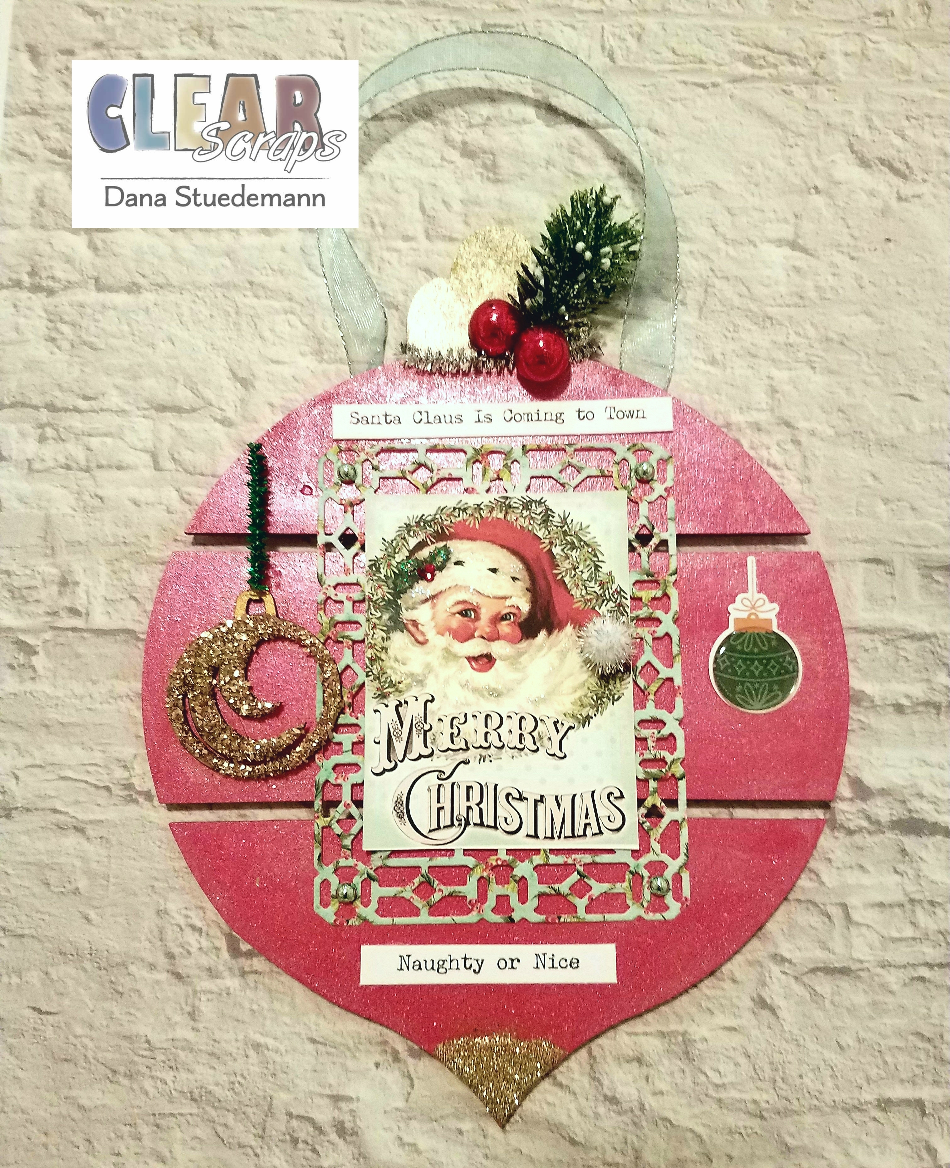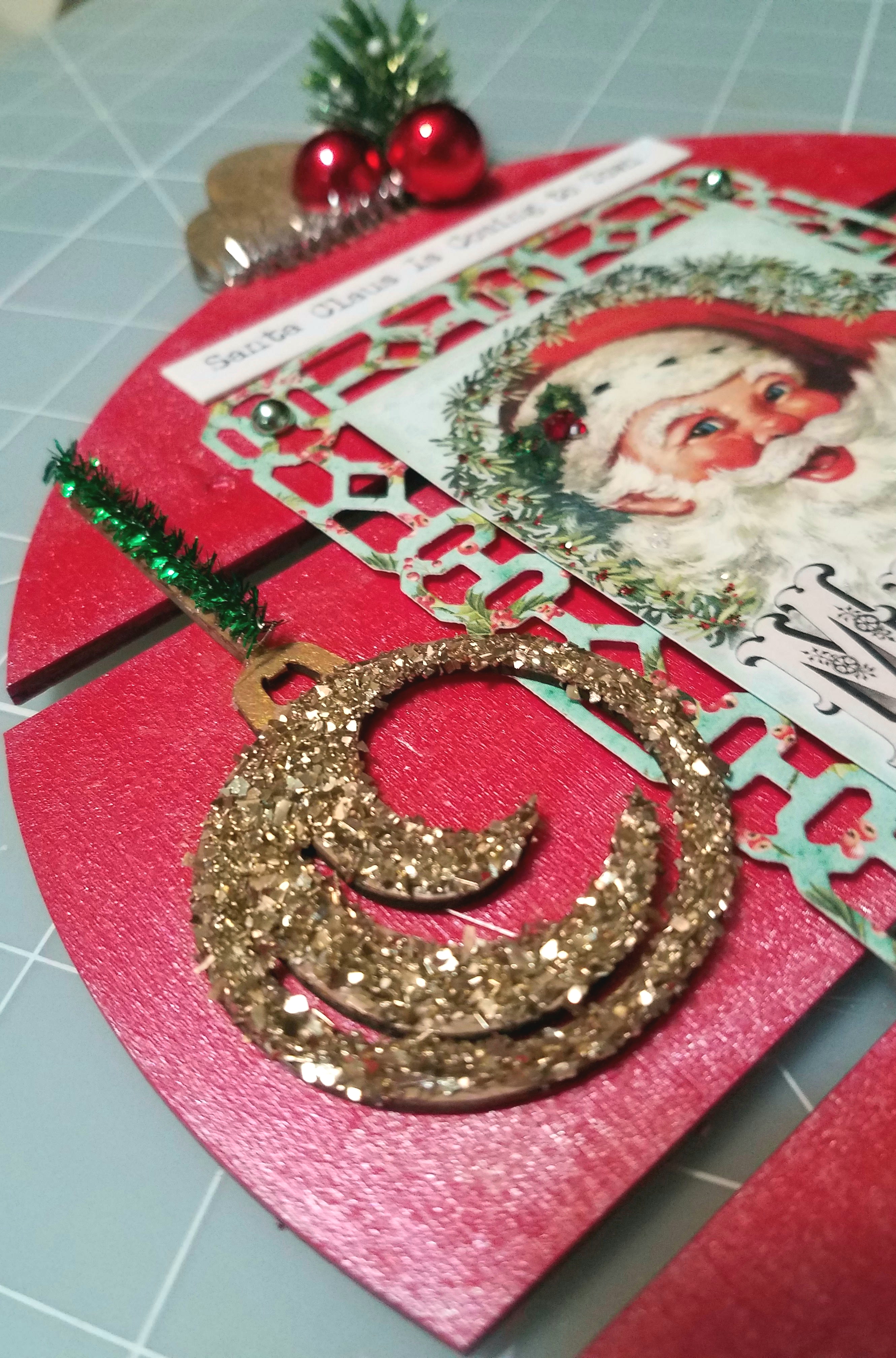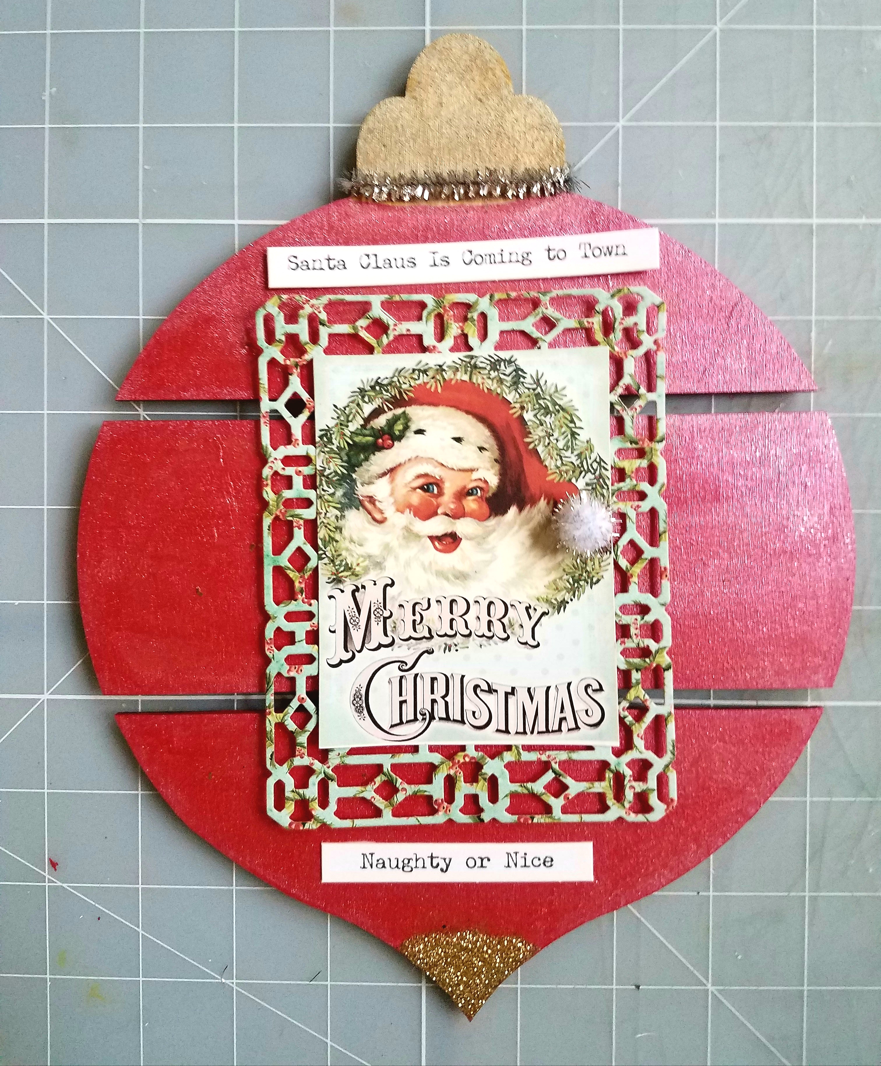 Next I cut out one of the journaling cards from the paper pack to use as my main focal point on my project. I diecut a Anna Griffin frame using one of the matching papers. Then glued my journaling card to the center of my diecut frame. Added foam dots to the back if my frame and adhered it to the center of my pallet. I glued a silver pompom to the top of Santa's hat. I adhered acouple quote stickers to the top and bottom of my Santa frame. I wrapped a piece of silver tinsel around the top of my ornament shape. Adhered it to the surface using Beacon 3 in 1 Glue.