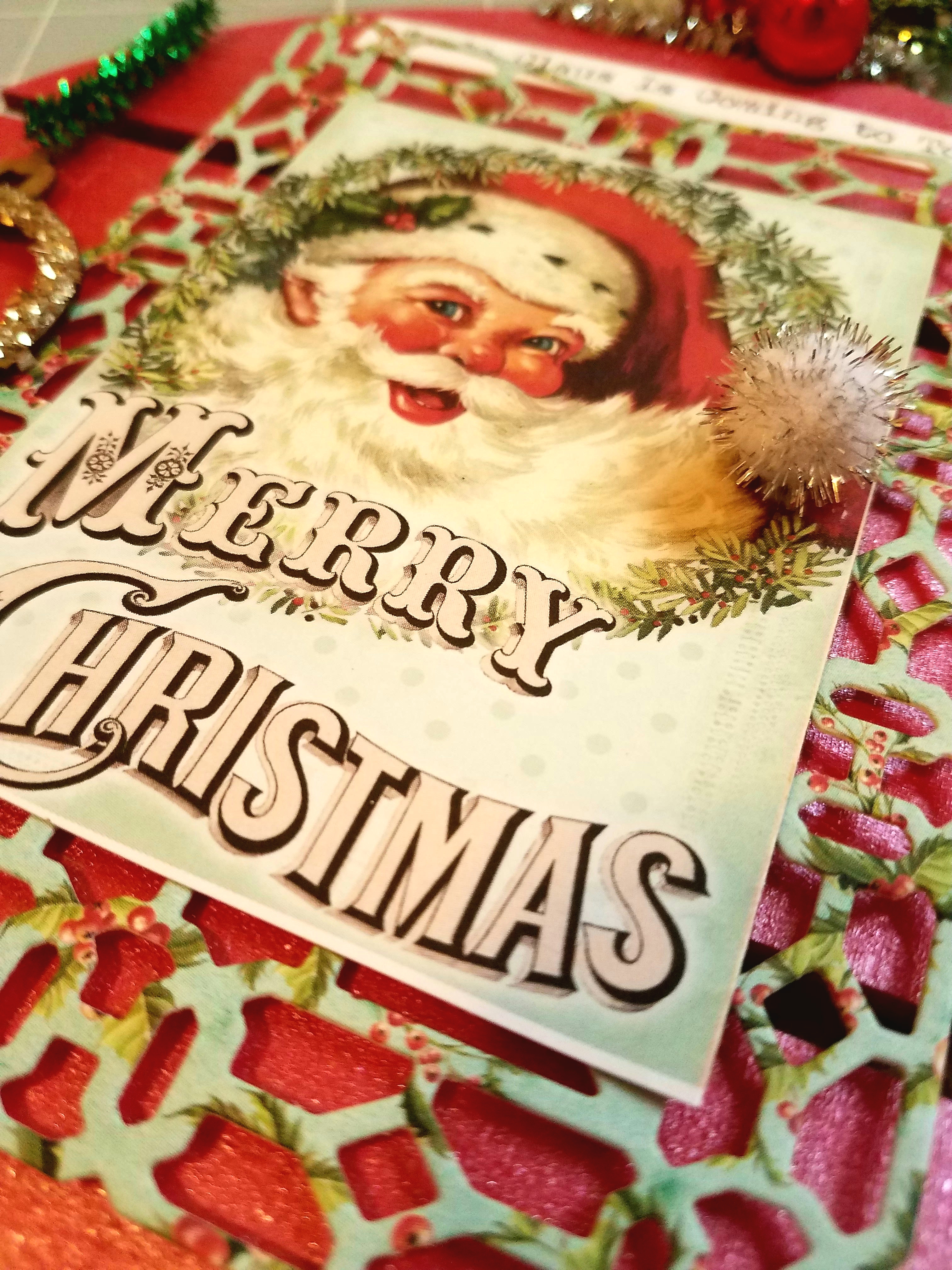 Next I fuzzy cut an ephermera ornament from my paper pack. Adhered one epoxy sticker on top of this ornament and glued it down on the right side of my pallet shape. I took some metallic green crystals and glued on each corner of my diecut frame to add alittle bling! I used some Stickles Star dust and Diamond glitters, to Santa's fur on his hat and on his beard.
