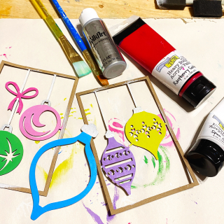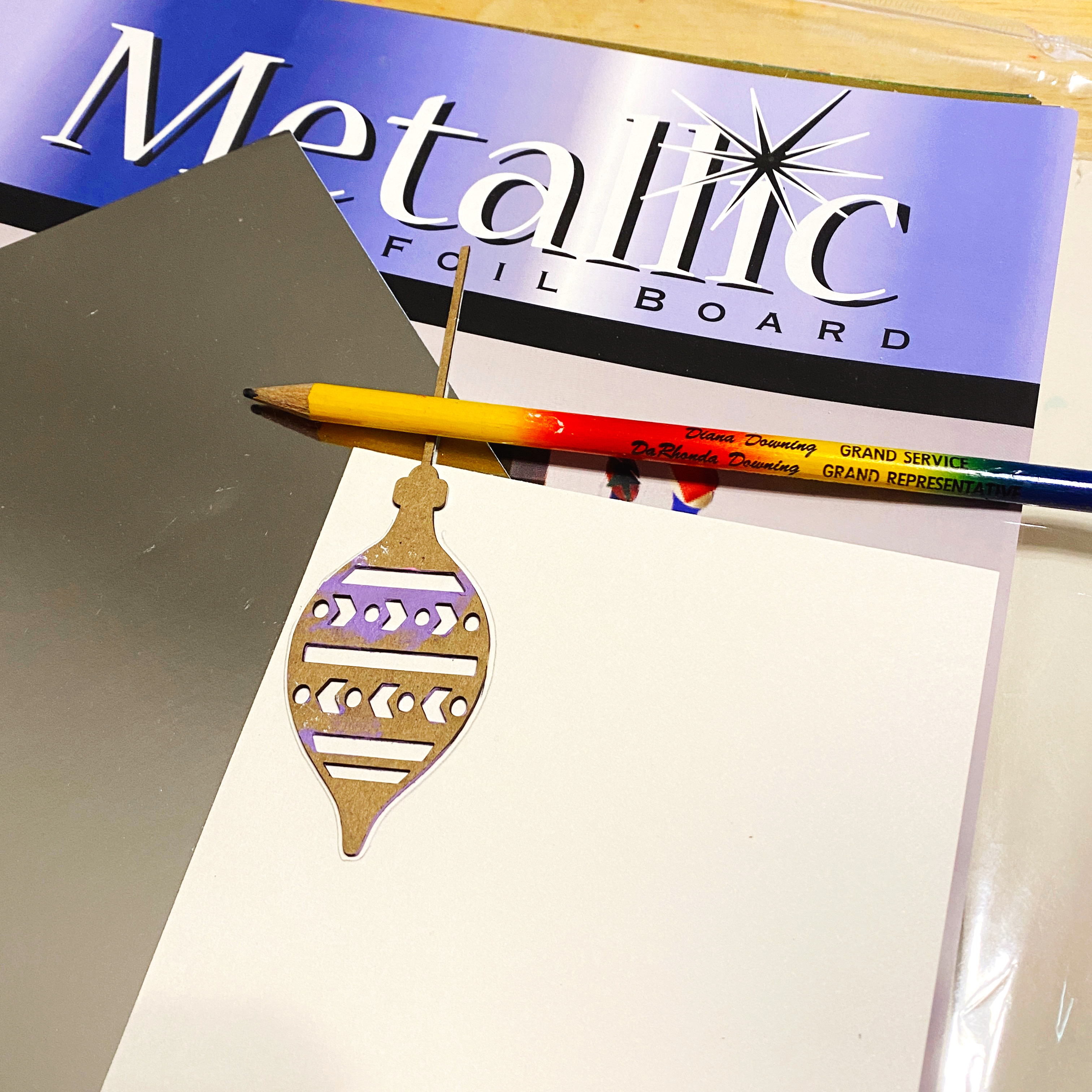 The designs on the ornaments are intricate, making it hard to use a liquid glue to adhere the foil board to them. So I used a dry adhesive on the back of the ornaments. This made it easy to adhere the foil board to the back of the ornaments without glue getting into the cut outs. Adhere all the foil board pieces to the backs of the ornaments and the the back of the shaker…