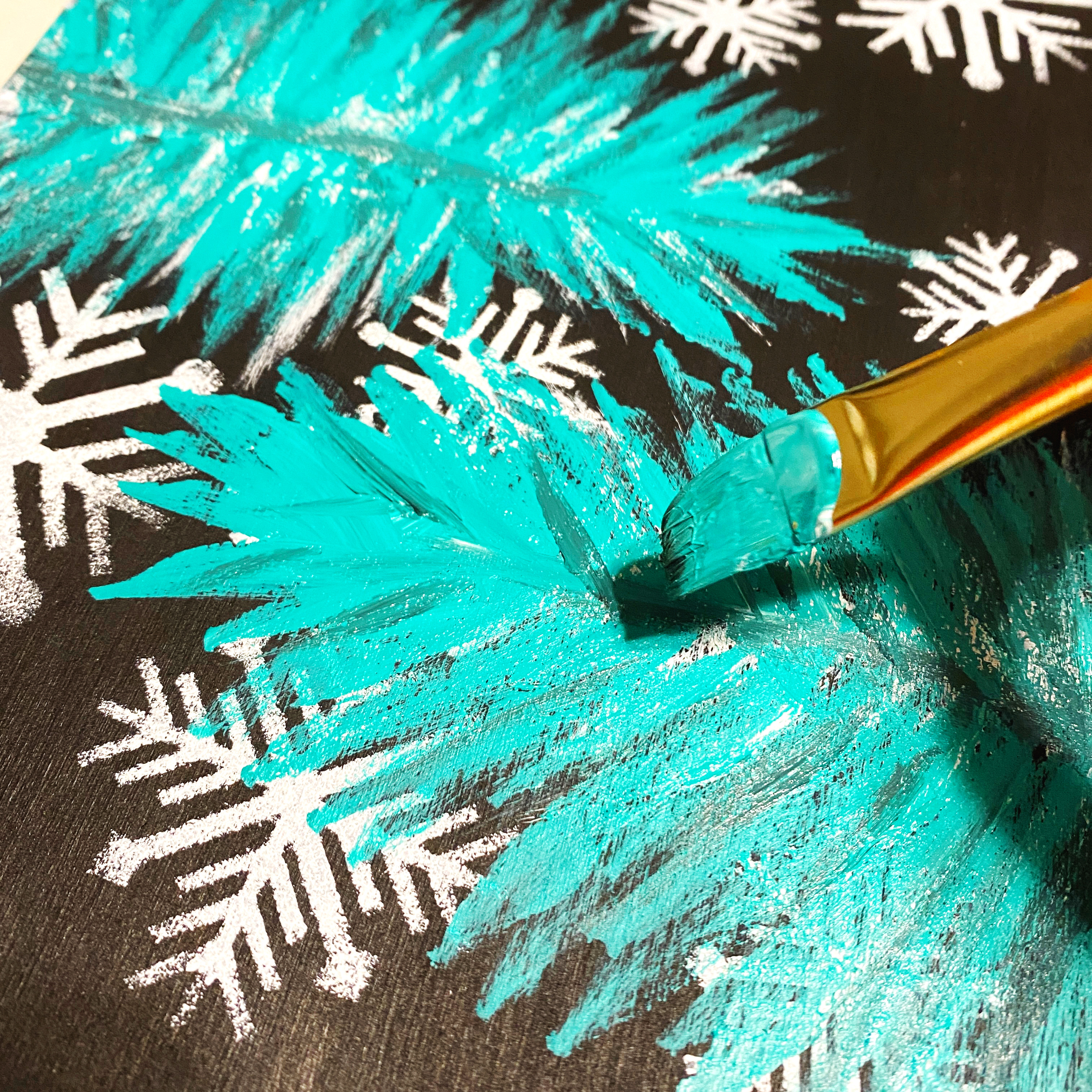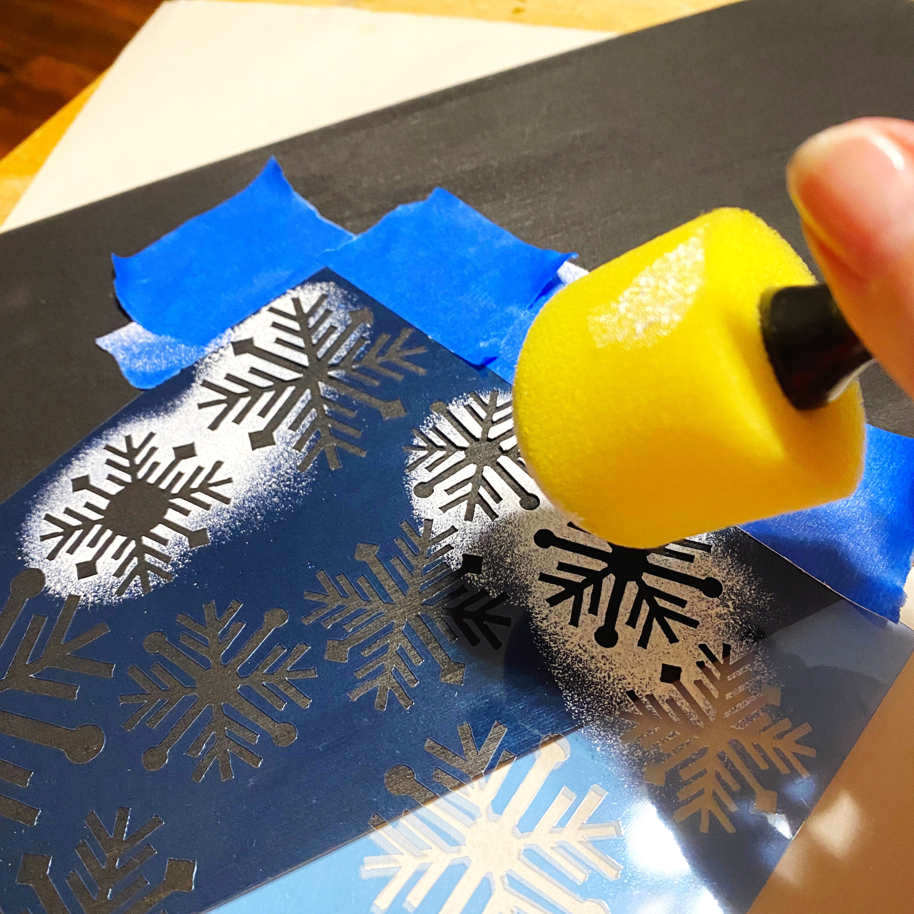 Snowflakes were added using the Nordic Snowflakes Stencil, white paint and the sponge brush. Use blue painters tape to secure the stencil as you move it around the tag. It's also helpful to tape of portions of the design you don't want, or the edges when the design you are using is close to the edge. Let each stenciled area dry before moving on to the next to avoid smearing the paint…