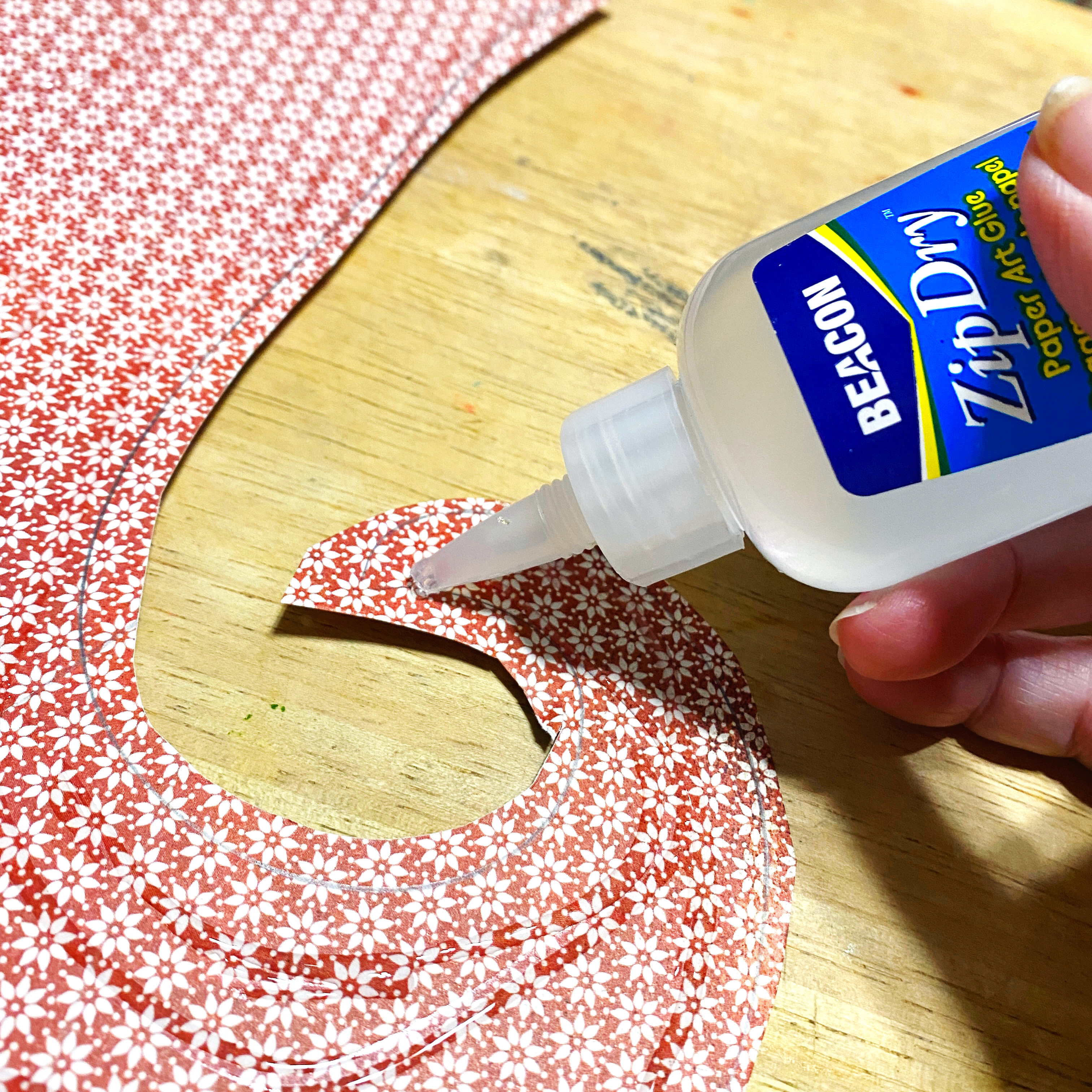 Then adhere the hat piece you cut out to the wood hat piece. I like to use Zip Dry for this because while it adheres very well when dry, you get a few minutes to pull it up and reposition or kinda push it in place. It's also easy to remove any excess glue that may ooze out; you can just rub it off when it dries. Make sure you apply the glue INSIDE the lines though…