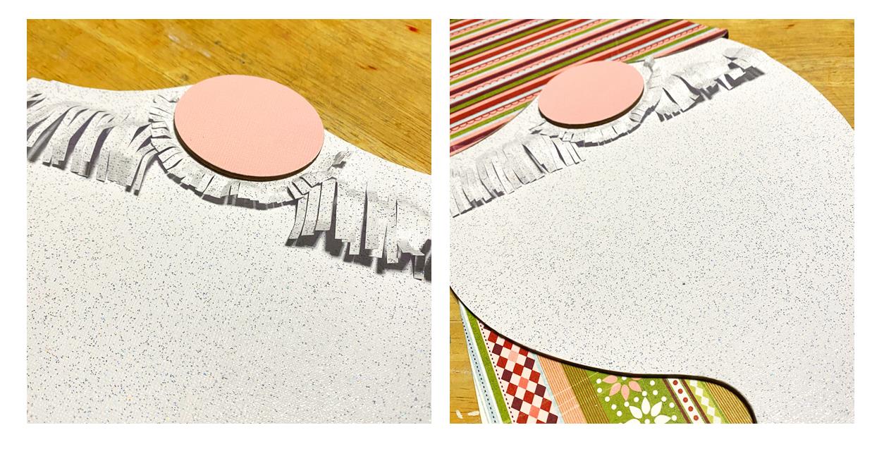 Next using the same methods as above, trace, cut out, adhere papers and file the following pieces: both bases (different printed papers), the hands and nose (both from pink cardstock) and the beard (white glitter cardstock). You will also need to cut slots in the paper to match the slots on both pieces of the base, a craft knife makes it quick and easy…