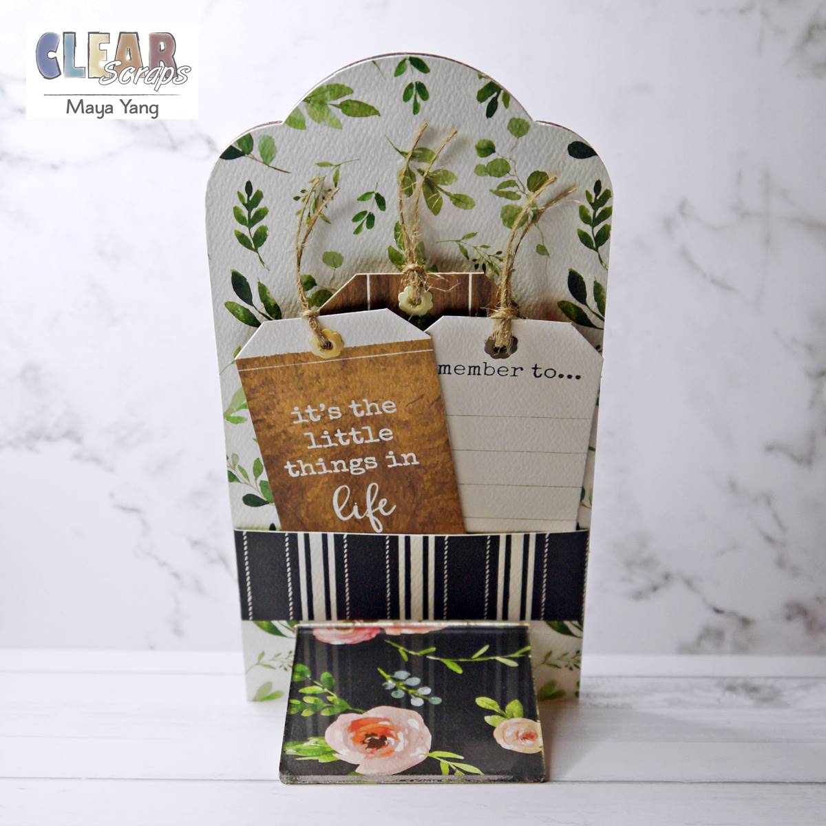 Here is the finished phone stand with a few front and back views. The front pocket can hold a tag with motivating words, bible verses, some reminders, or a photo. The back pocket is for storage of all the tags.