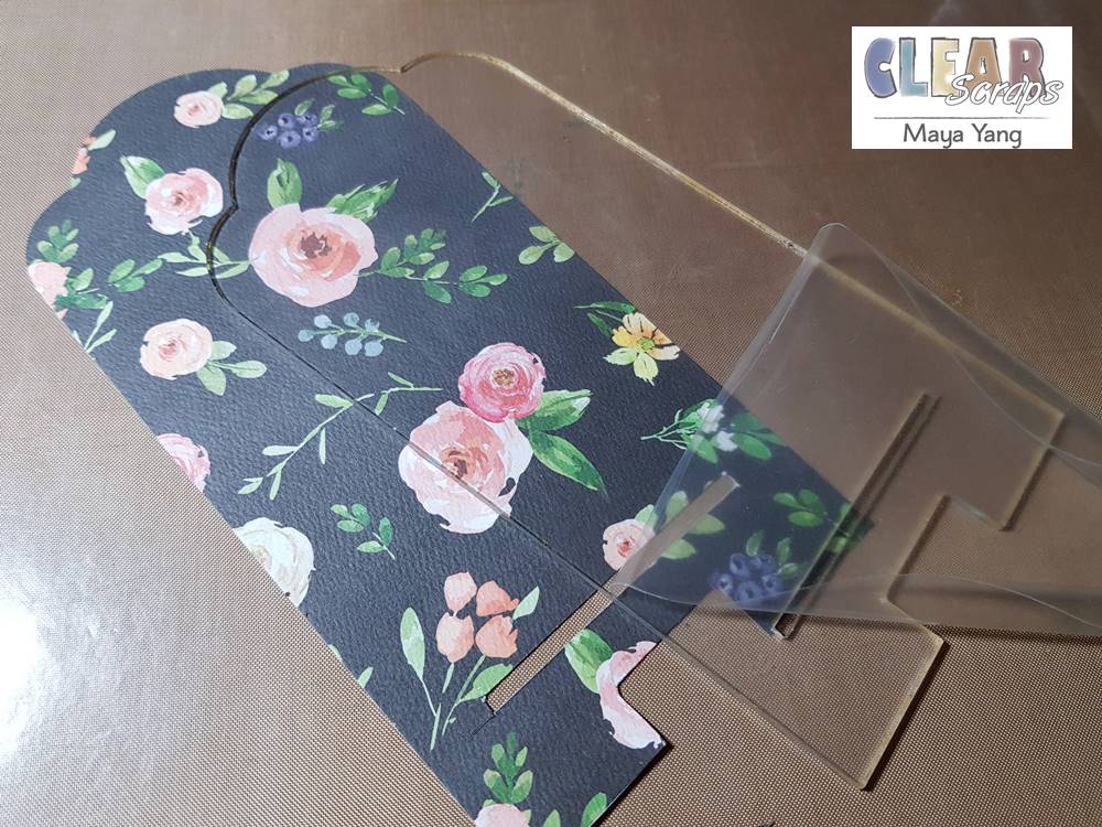 ▼ First, I chose a patterned paper, traced the acrylic pieces to the paper and cut them out. Before we glue the paper to the acrylic piece, remove the film from both sides (It's for keeping the acrylic stand crystal clear!)