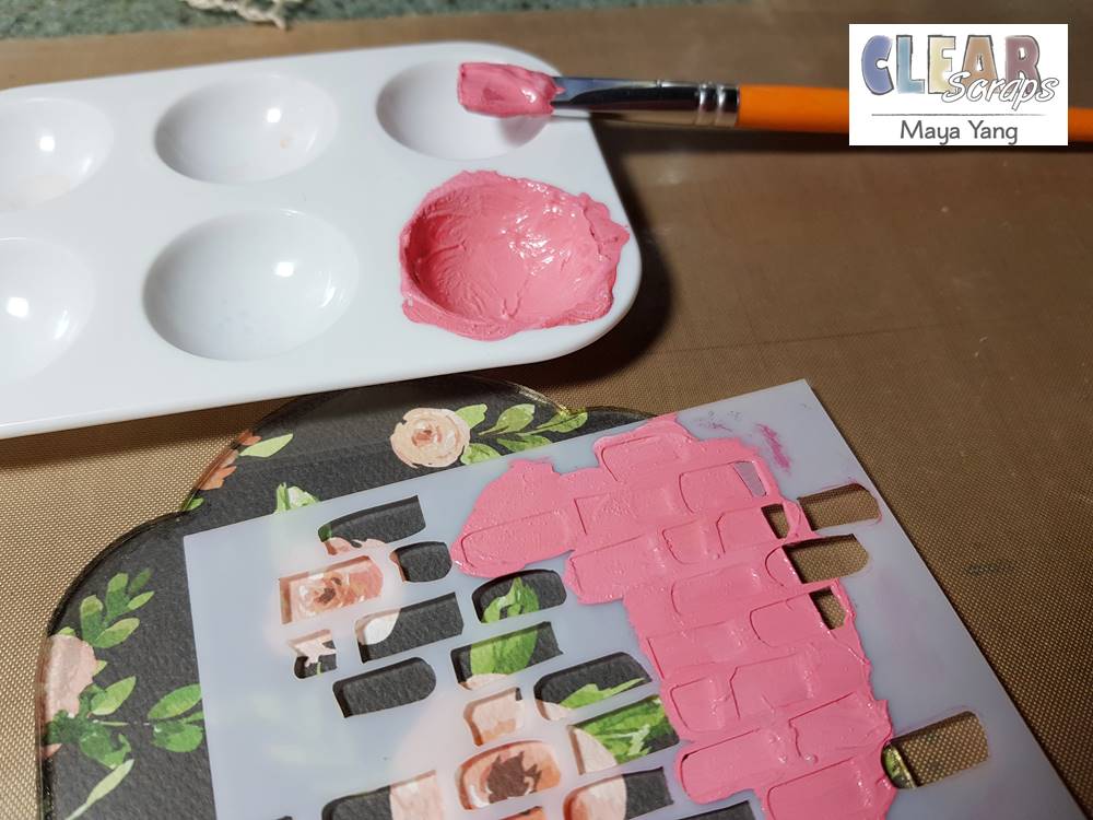 ▼ Here I decided to add some texture by using pink acrylic paint along with Brick Wall Masking Stencil.
