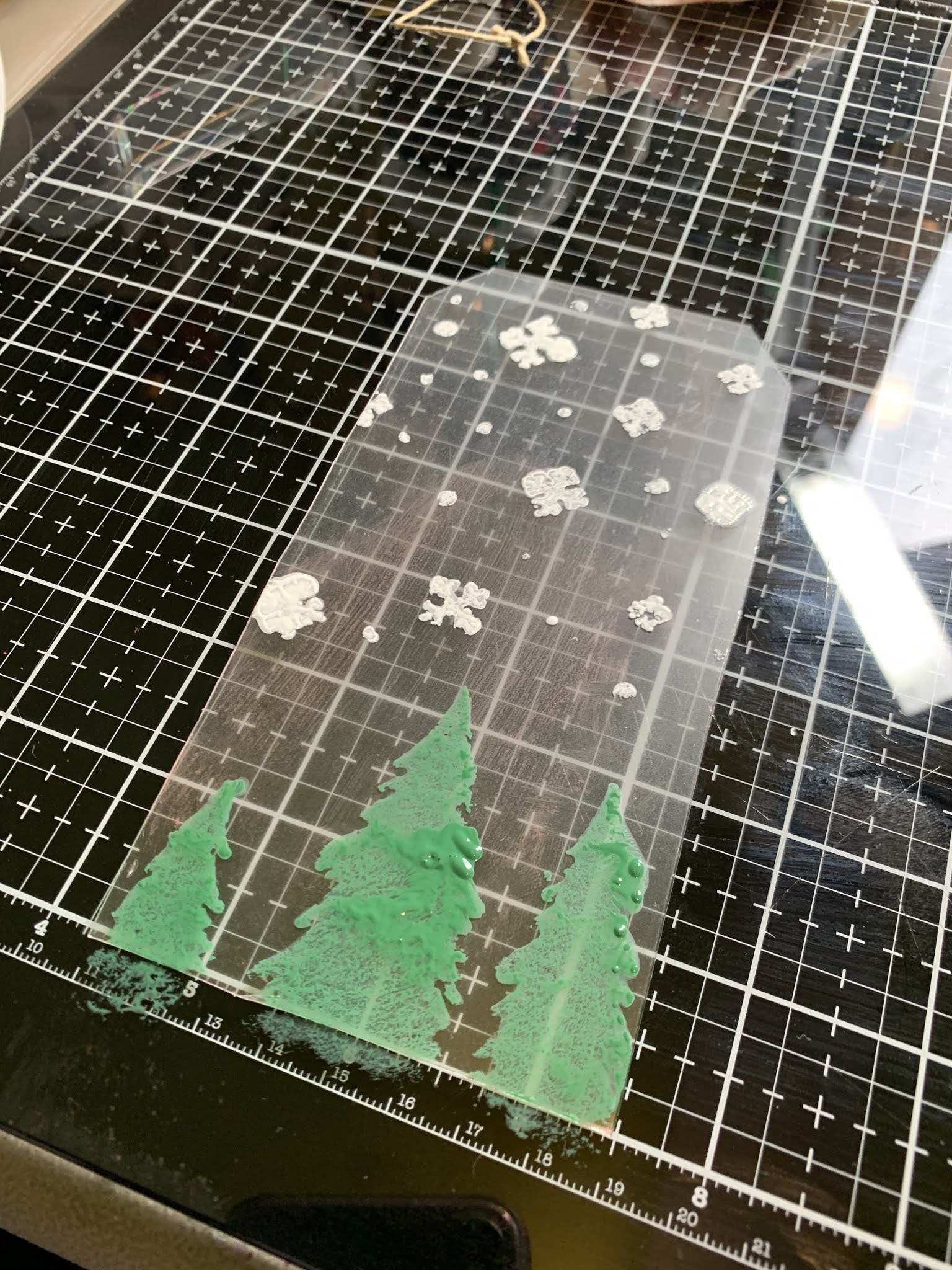 Paint trees and snowflakes onto clear cut acrylic tag and let dry.