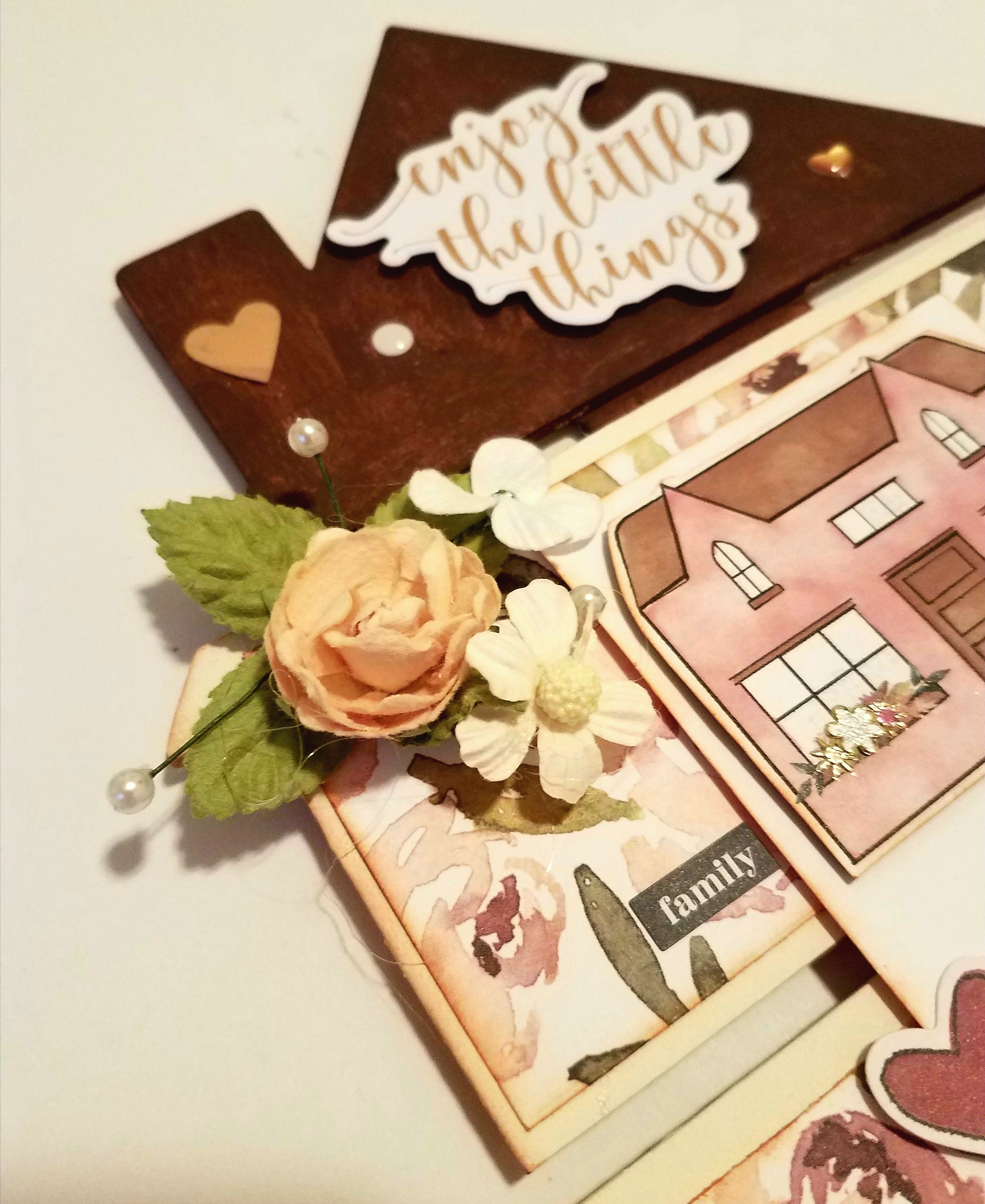 From the ephermera pieces I chose a sentiment "enjoy the little things" added some pop dots to the back and adhered this on the roof. I applied one of the heart stickers to the chimney and on each side of the sentiment I added a tiny gold heart sticker and a White enamel dot.