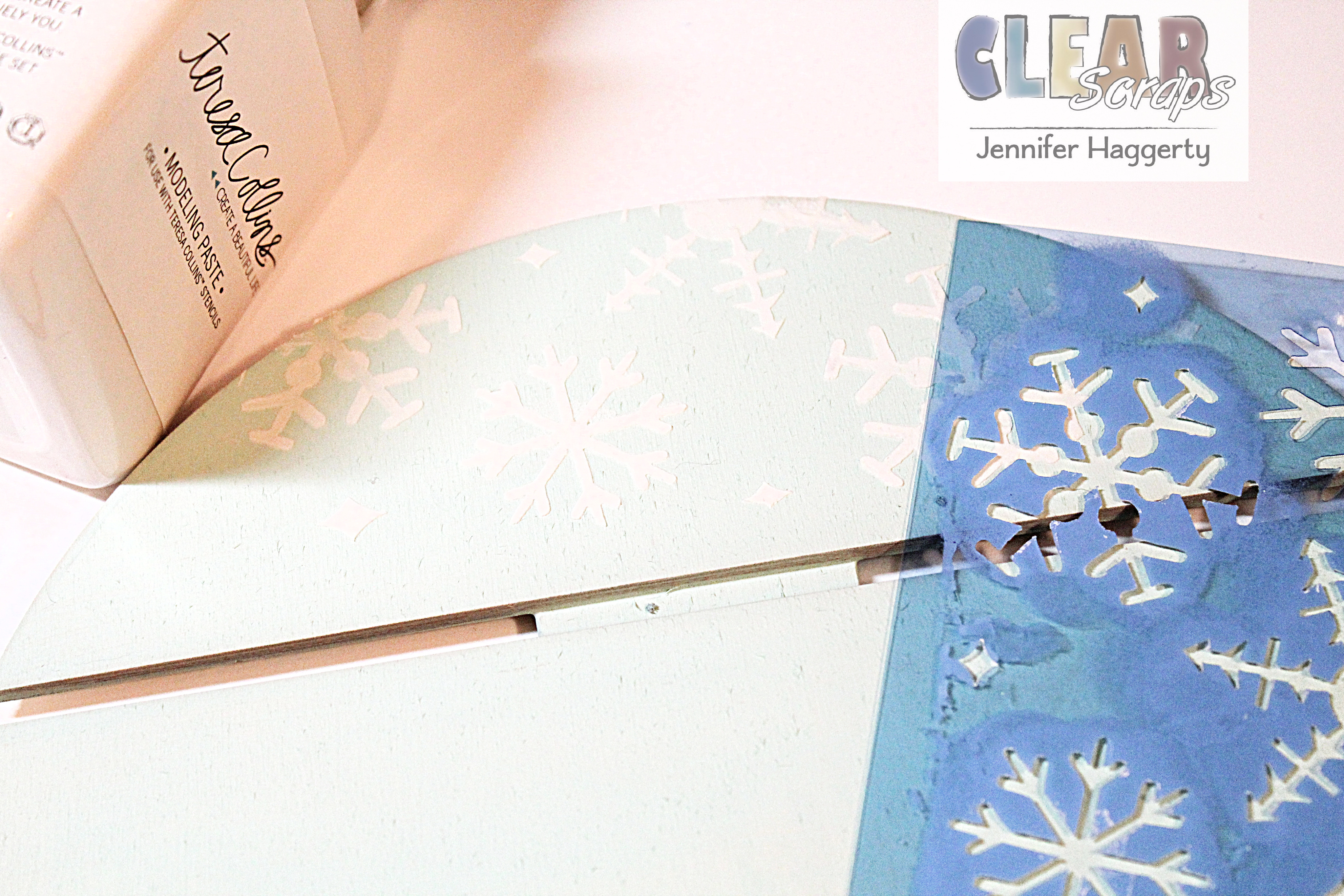 Here is a close up shot of the modeling paste with my Mascil. I chose to leave the paste as is to help the snowflakes pop against the light blue paint.