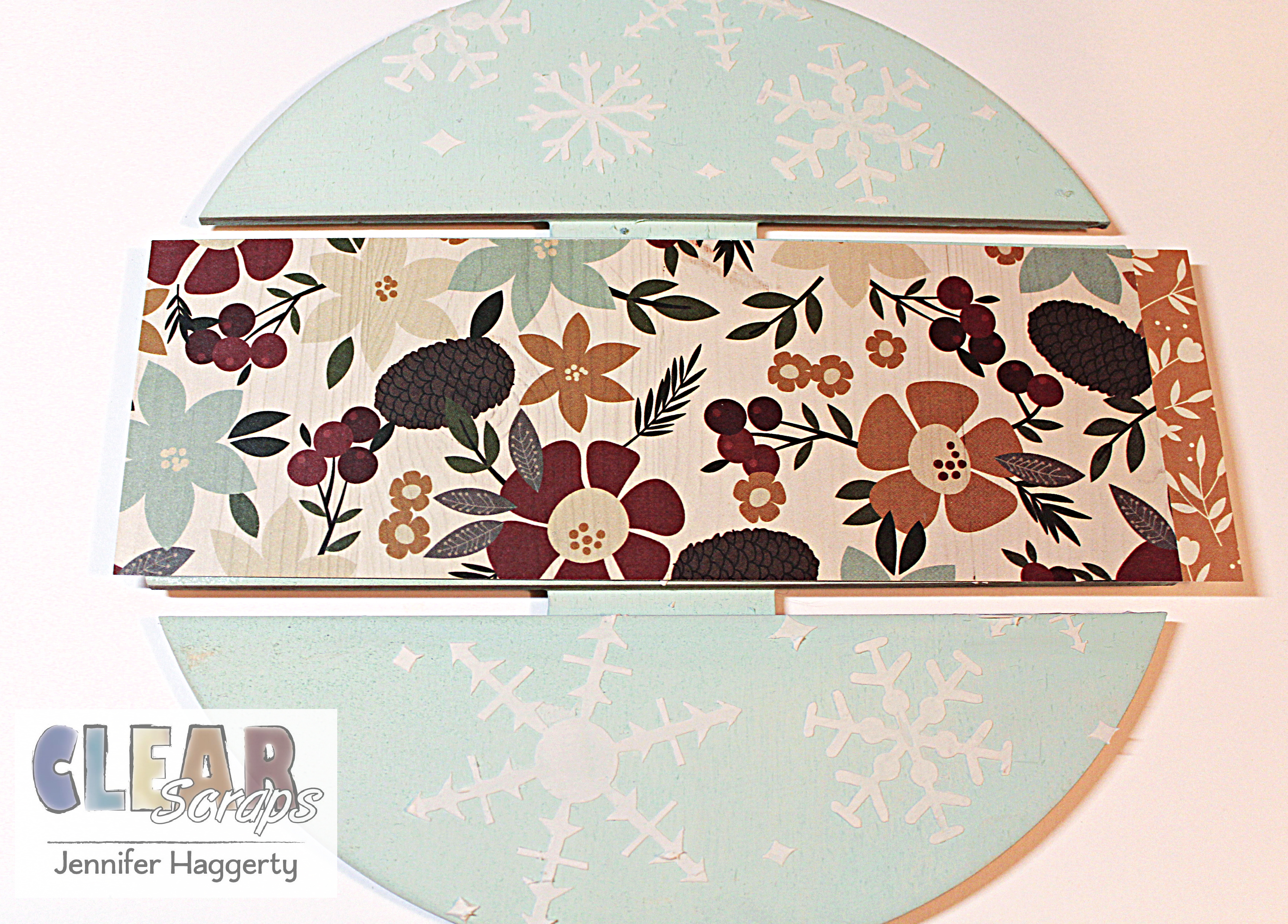 The chalk paint dries quickly so I was able to move onto my next step. I applied a light layer of modeling paste using the 6 Inch Nordic Snowflakes Mascil to the upper and lower slats.