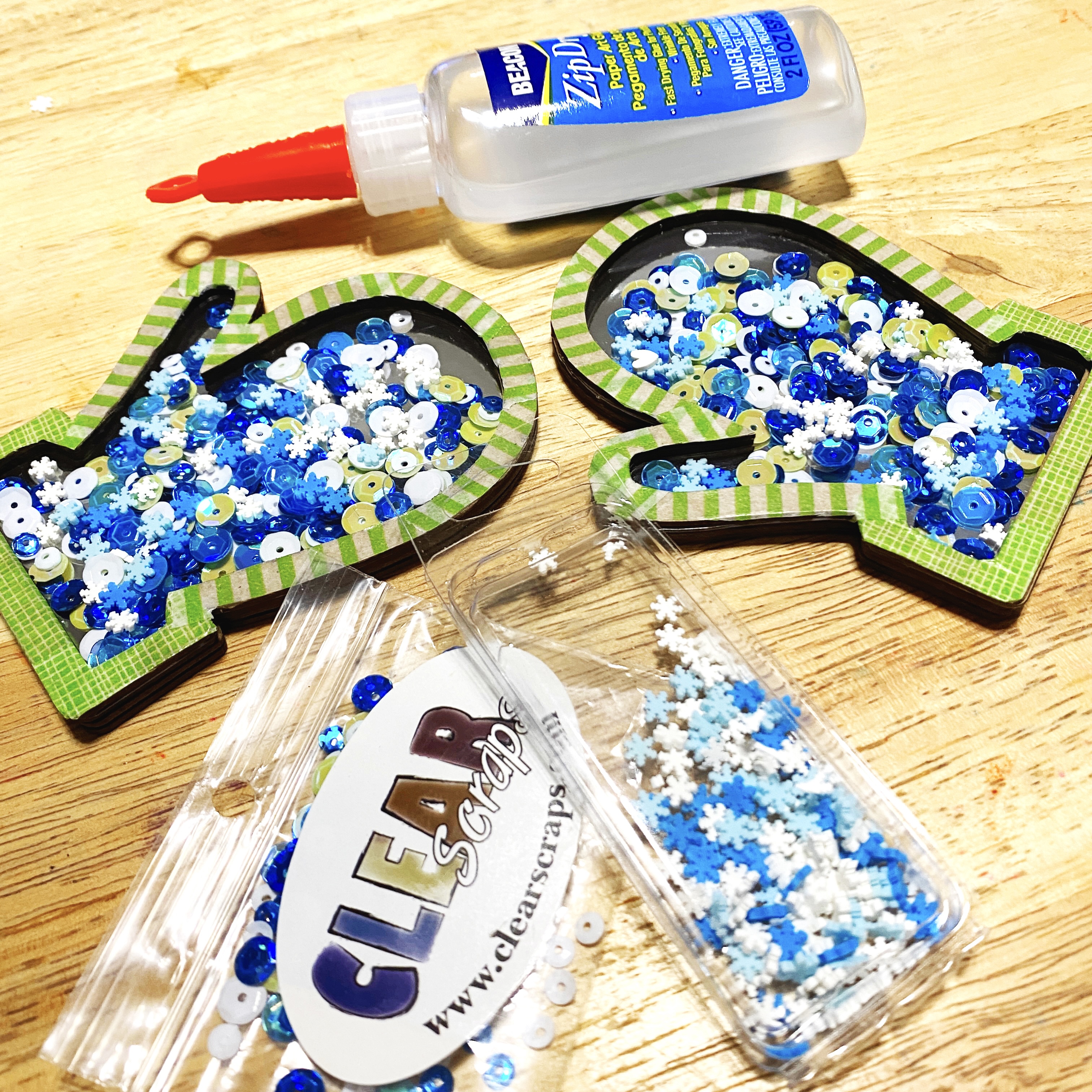One thing I like to do with acrylic, is to layer different mediums on the front and on the back. This created dimension and allows you to "layer" products that might not play well together, or might not achieve the same look as when they were both added on the same surface. I also added a piece of Silver Metallic Foil Board to the back to reflect light and give the piece a shimmery look. Mini Shaker Box Mittens filled with Sprinkles Winter Flake Mix add a fun accent to the sign…