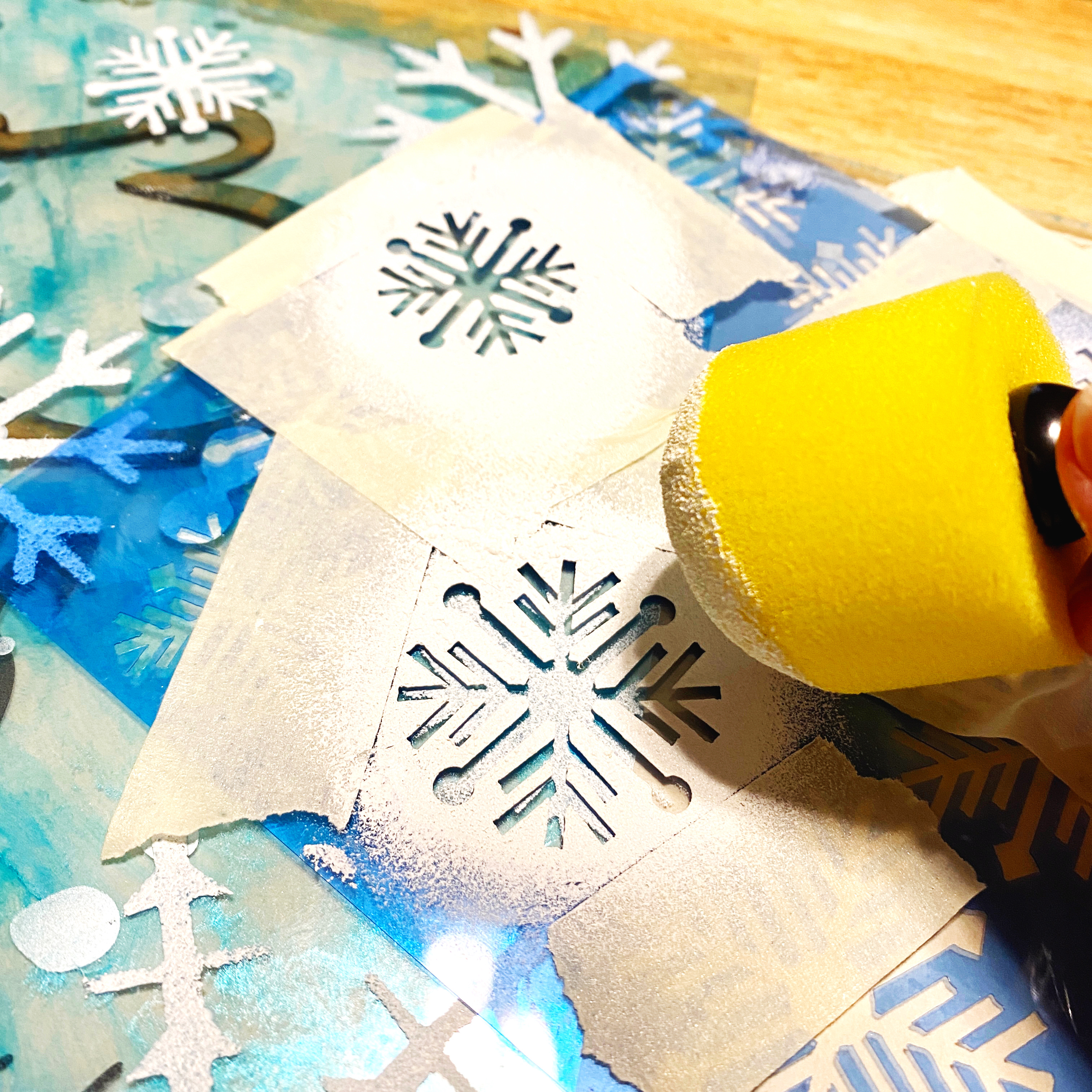 Once the snowflakes have dried, I added a frosty edges to my sign by pouncing white paint around the edges…