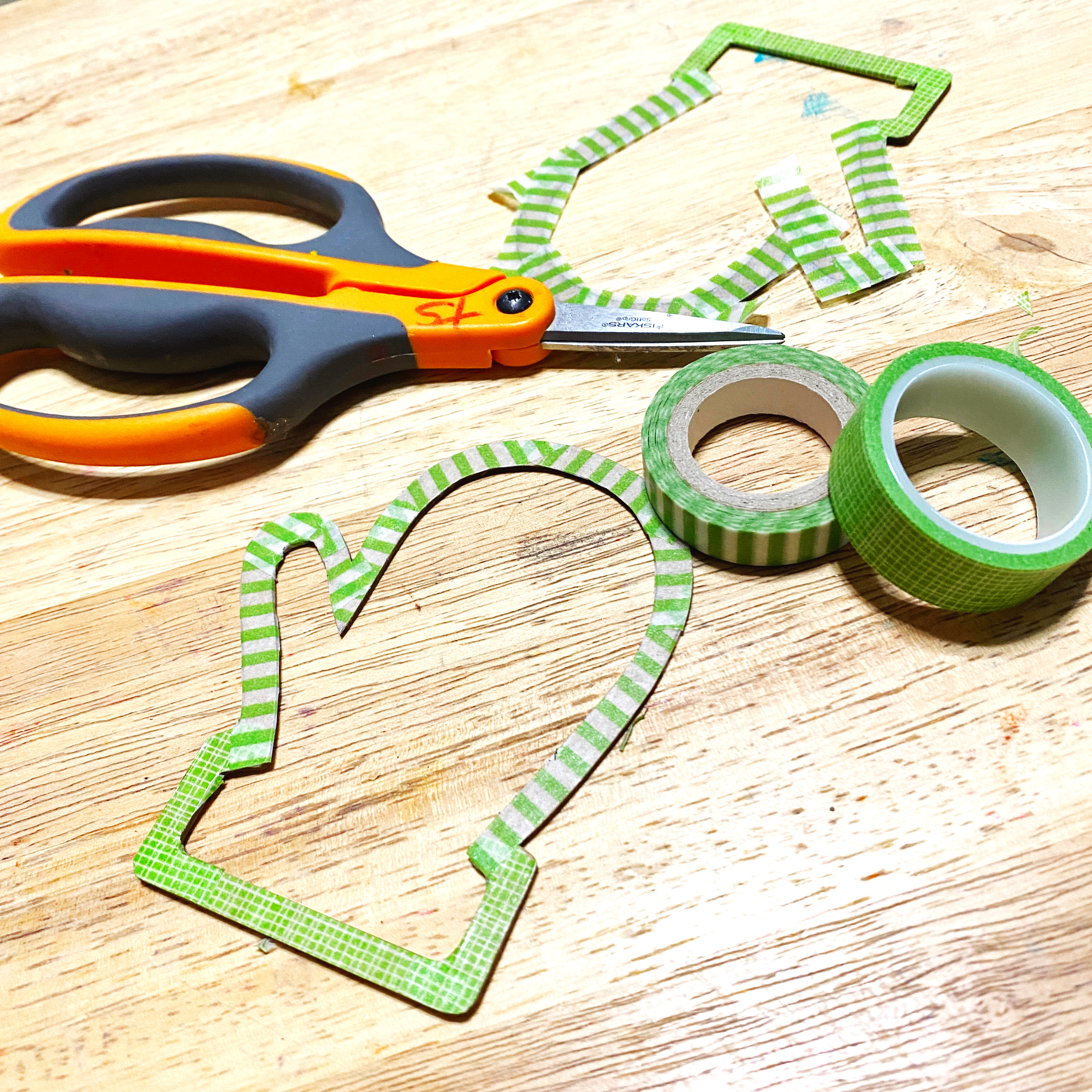 I wanted a stripe on the mitten, so I grabbed some washi tape. I placed strips of striped washi tape on the top layer of the shaker around the hand part of the mitten, then trimmed off excess with scissors. I used a more solid design washi tape around the cuff portion. The shakers were then assembled except for the acrylic and top layers and filled with Sprinkles. After filling, the acrylic and top layers were adhered on the shakers…