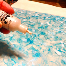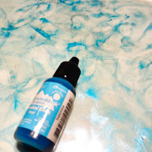 I started by removing the protective film from ONE side of the Acrylic Sheet. Then I added drops of aqua alcohol ink and swirled it around the entire sheet: you don't need to cover it completely; let dry. Then I added drops of white pearl alcohol ink all over to look like snowflakes. Let this side dry completely.