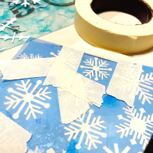 Turn Acrylic Sheet over and remove protective film from the other side. Use 6" Nordic Snowflakes and 12" Ice Crystal Snowflakes stencils with white paint and a sponge pouncing brush to add snowflakes over the front on the Acrylic Sheet. A few hints to make this step easier. When using any stencil where the designs are close together, but you only want to use portions of the stencil, use tape to mask off the designs close to the one or ones you want to use. Also put a piece of tape to cover an edge of a stencil when a design you want to use it close to it. And be sure the designs you add have dried before repositioning your stencil to avoid smearing…