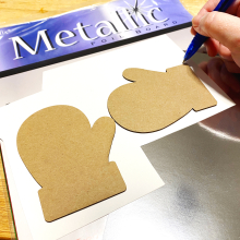 Next, it was time to embellish the Mini Mitten Shaker Boxes. I traced both mittens on a piece of silver foil board, cut them out and adhered the to the bottom layer of the shaker boxes…