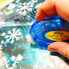 Now it's time to put it all together. One thing to remember when working with clear acrylic is that glues or adhesives used to layer the pieces will need to be covered or they will show. You could also punch holes and use ribbon or twine to hold pieces together, but for this project, I was using a tape runner. I cut an 8 X 8 piece of silver foil board for the back, and trimmed my quote down a bit. To determine where to place the adhesive, I laid the quote and the mittens UNDER the acrylic sheet – with the snowflake side up. I arranged them, then used a marker to add small dots at the centers of the mittens. That is where I placed my adhesive to adhere the foil board to the back and the quote to the front.