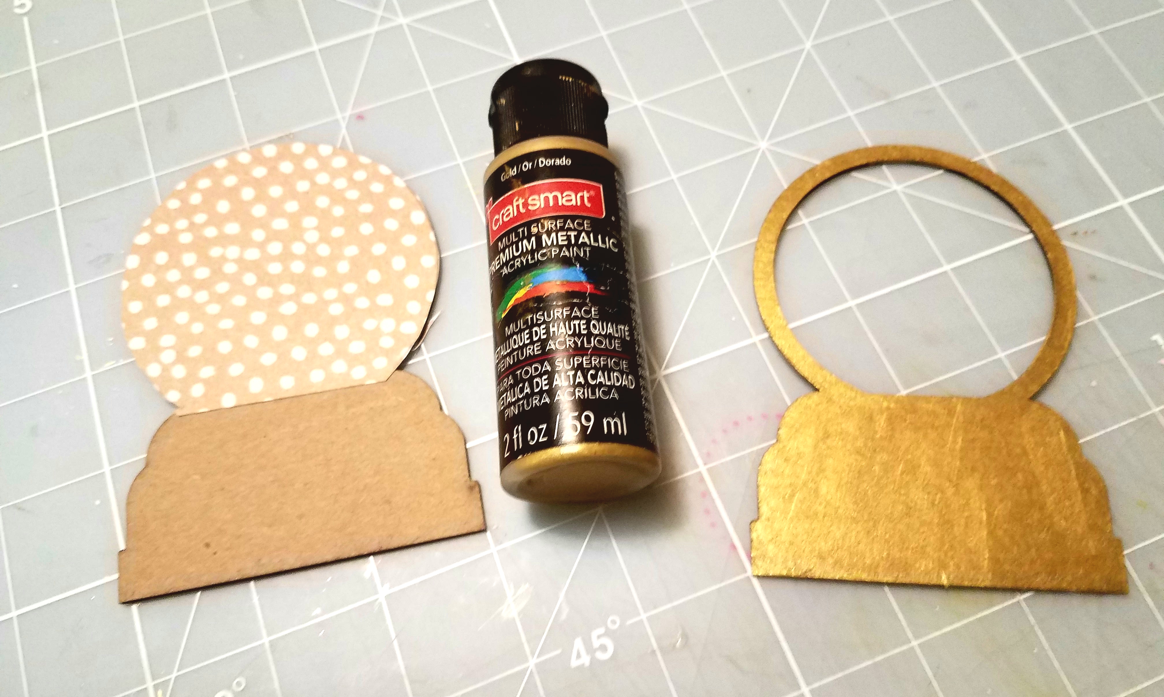 First we'll create our shaker. Take the top chipboard shaker shape and paint the front and sides with gold acrylic paint. Let dry. Next I chose one of the papers to cover the top part of my snow globe. Trace with a pencil and cut this piece out. Then adhere to your bottom chipboard piece using Beacon 3 in 1 Glue.