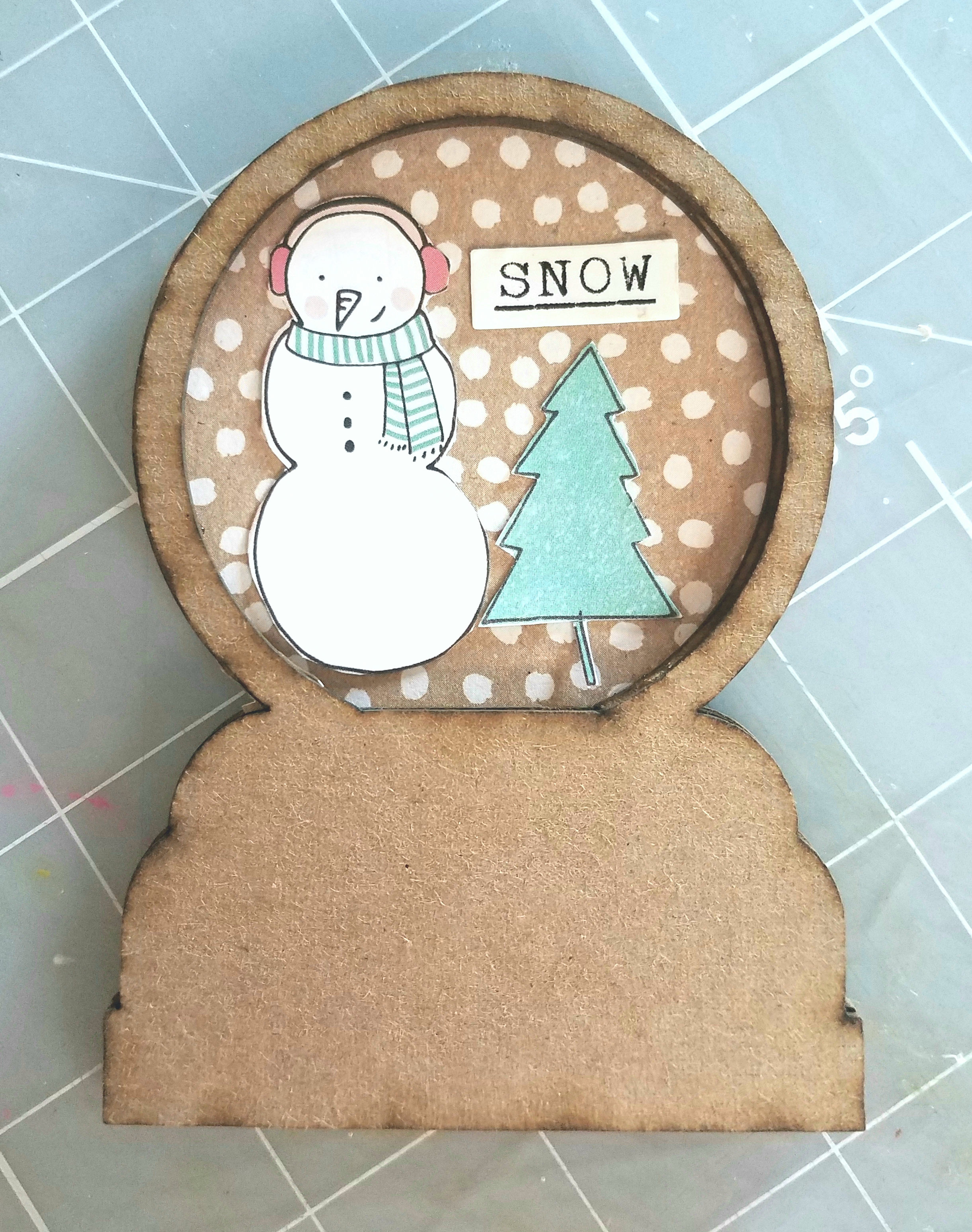 After this dries, take sandpaper or your distress tool and smooth the edges. Next I fuzzy cut out a snowman and tree and adhered those on top of my snow globe piece. Make sure it lines up and shows through the snow globe space. I added a Snow word sticker on the right upper corner.