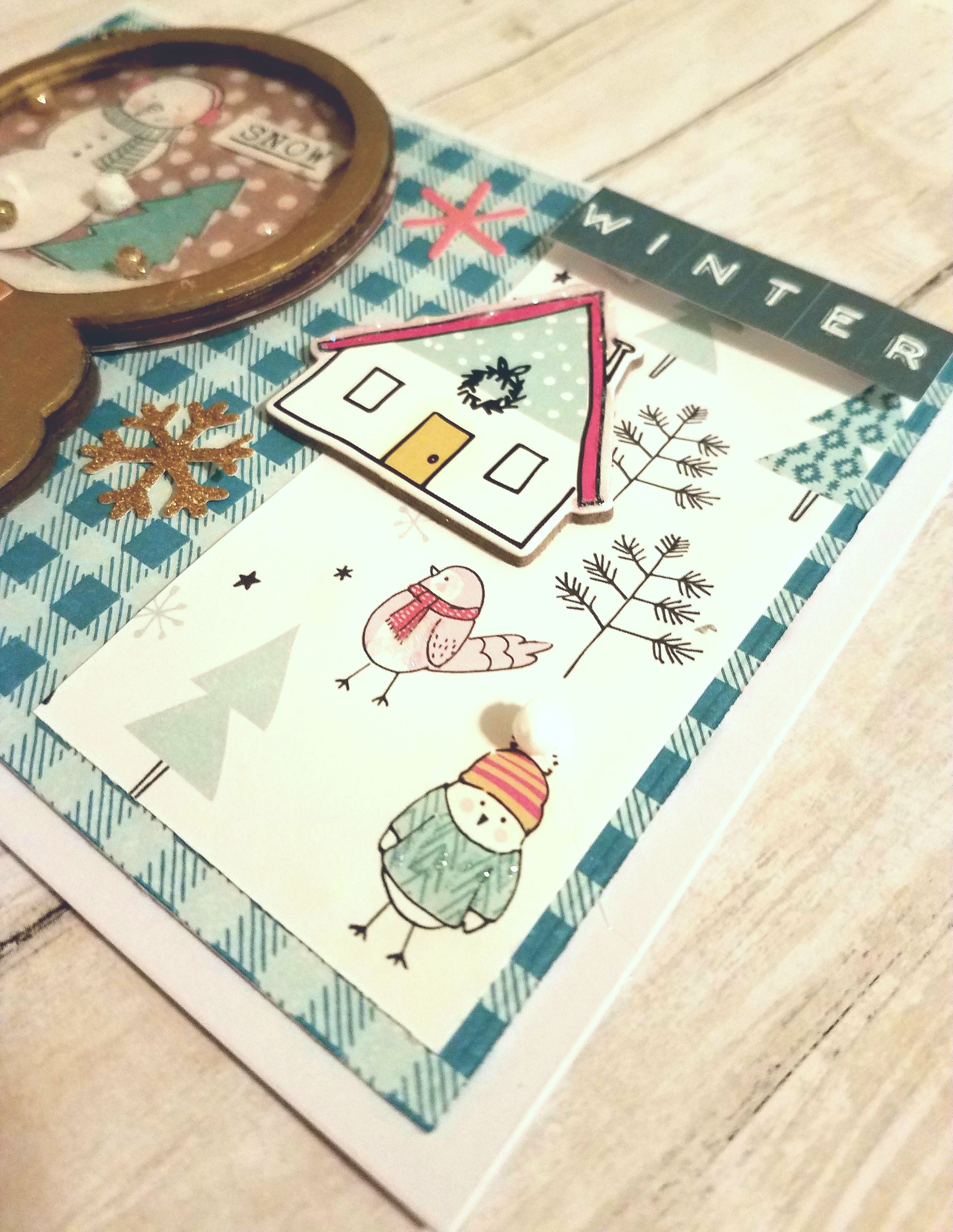 For my card: base measures 7×5. I cut out a coordinating paper at 63/4 x 4 3/4 and adhered it to my card base, leaving about a 1/4 of white card showing. Next I cut another coordinating paper at 21/4 x 4 1/2 inches, and adhered this on the right side of my card. Take your snow globe shaker and adhere to the left side of your card using Beacon 3 in 1 Glue. I added pop dots to the back of my Winter sentiment and adhered on top right side of my card. Scattered a few snowflake stickers to my card, a chipboard sticker house and a white pom pom on the little bird's hat. Lastly I added Stickles Stardust glitter around the roof of the house, bird's tummy and bird's sweater.