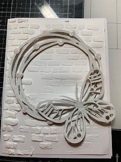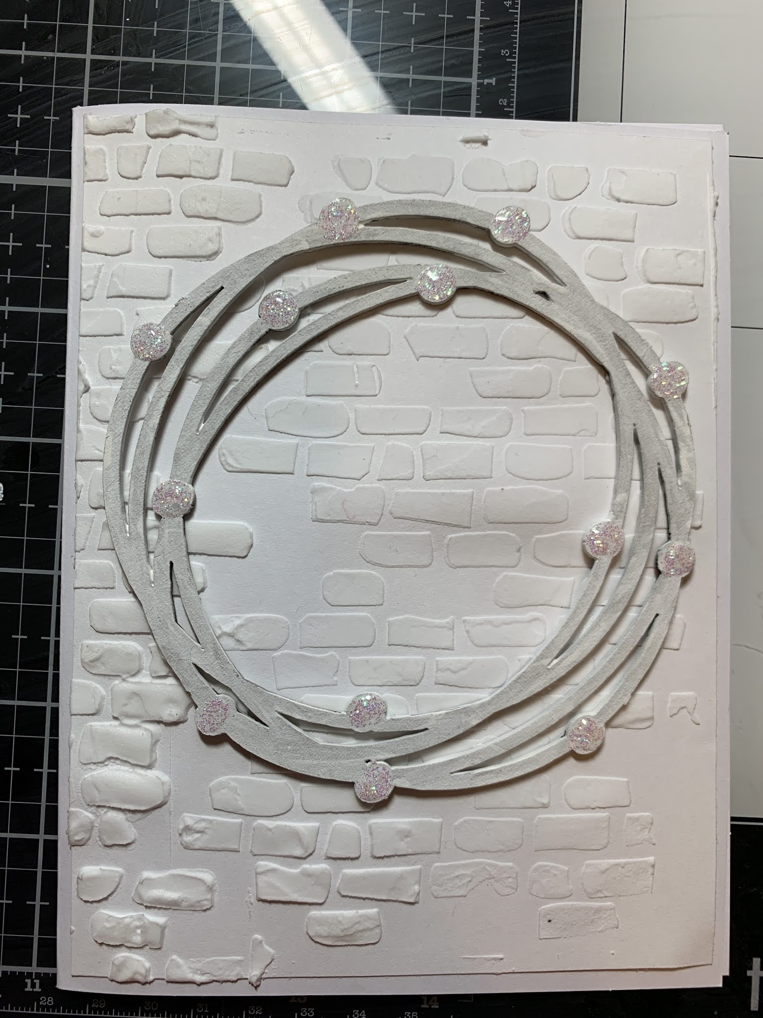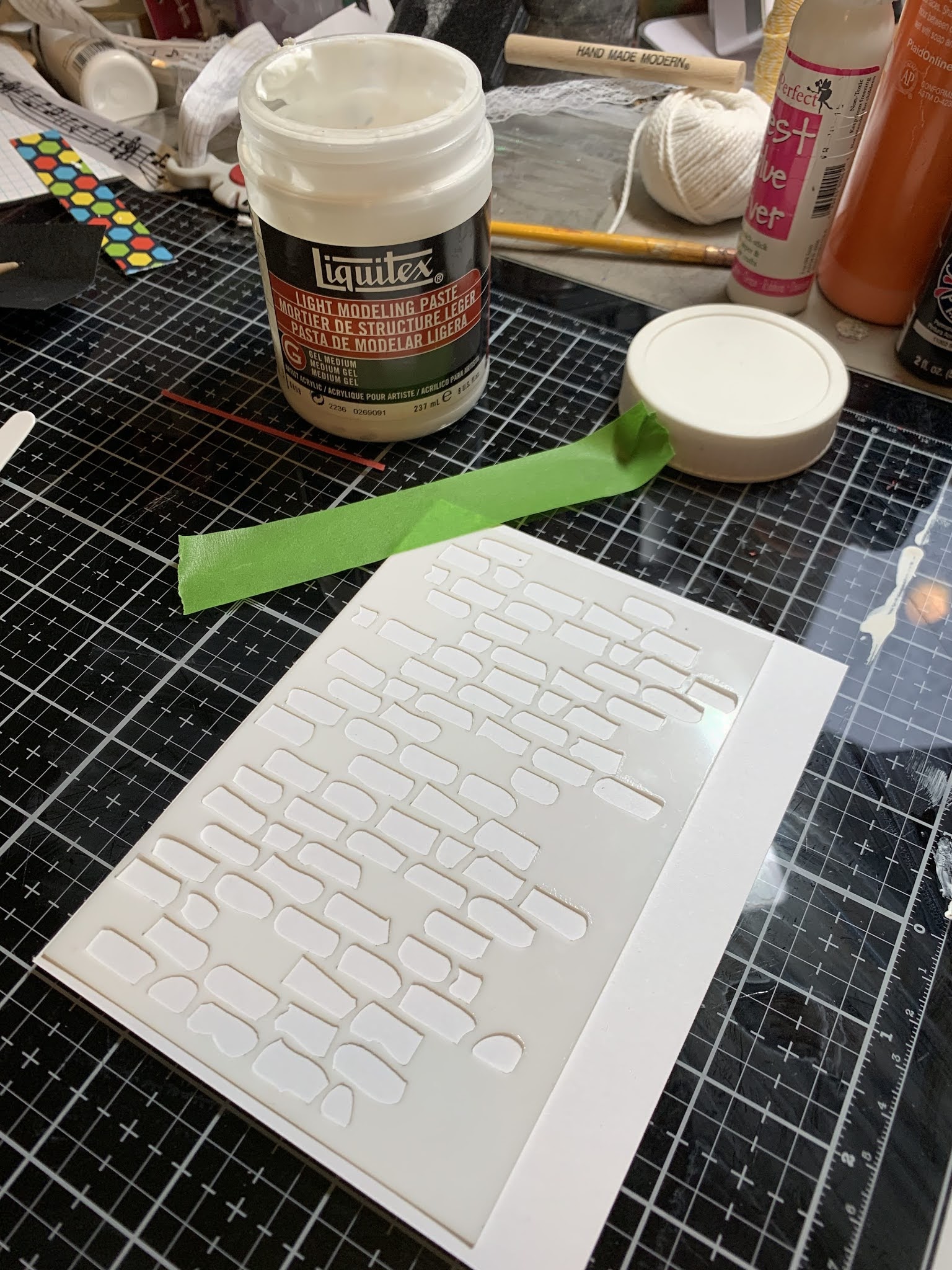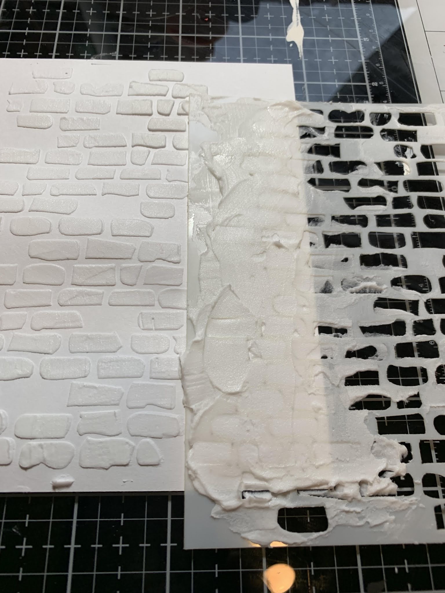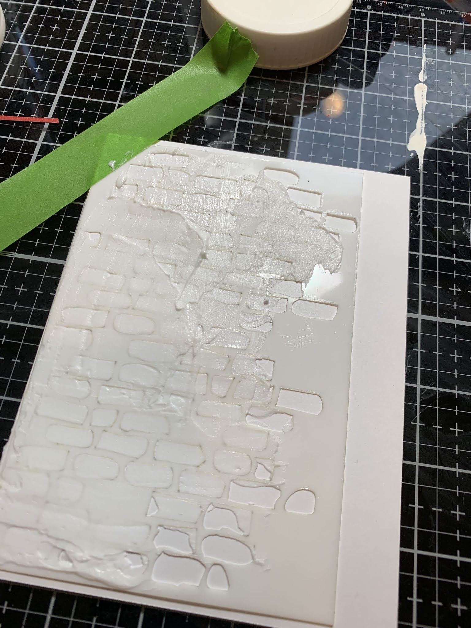 Start by securing your Clear Scraps 4 x 6 Brick Wall Stencil over a piece of white card stock that is trimmed slightly smaller than your card base. Apply Light modeling paste over stencil.