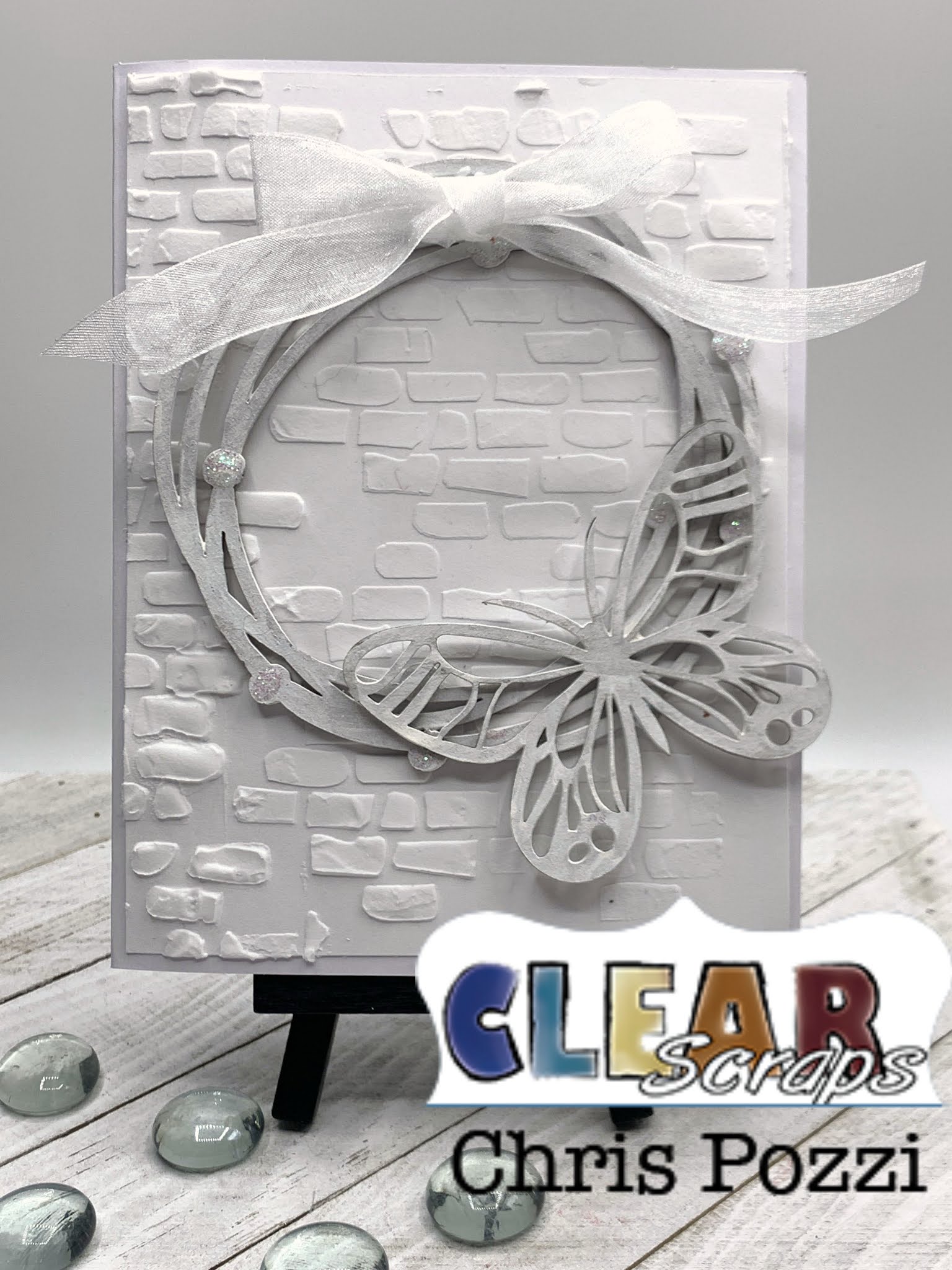 Wintery greetings! I have been inspired this month to create some projects that are white on white! When finished, the projects have such a winter-y feel to them! Today I am excited to share this Winter-y white card I created with some of my favorite Clear Scraps supplies!