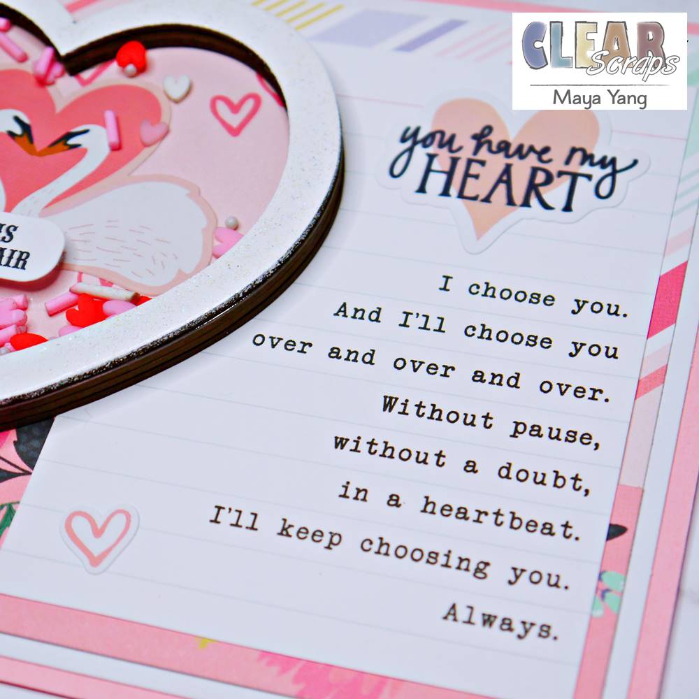 ▼ On the chip back, I traced the heart shape to a patterned paper, cut it and glued the paper to the chip back. I also added a sticker with two swans to the middle of the heart.