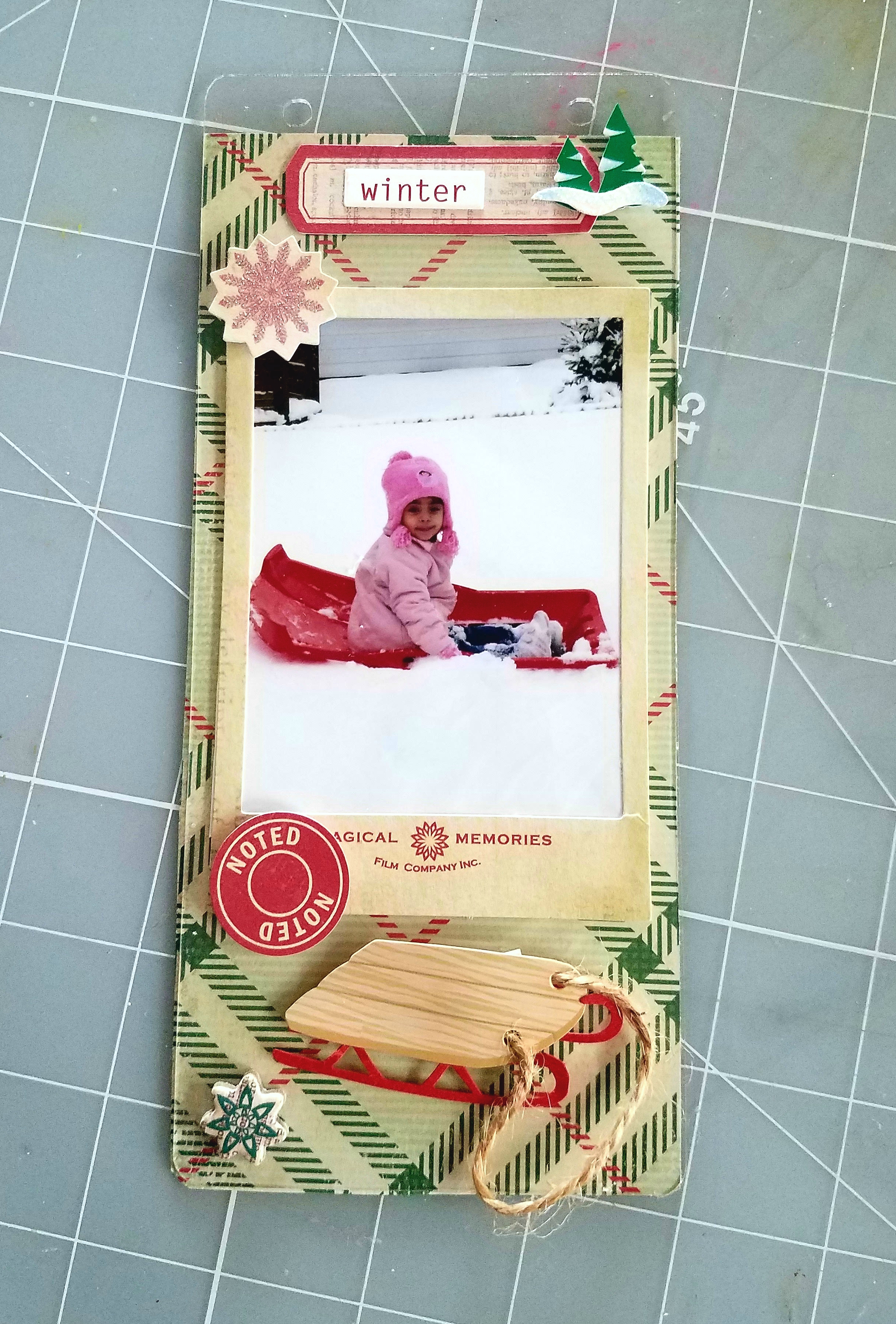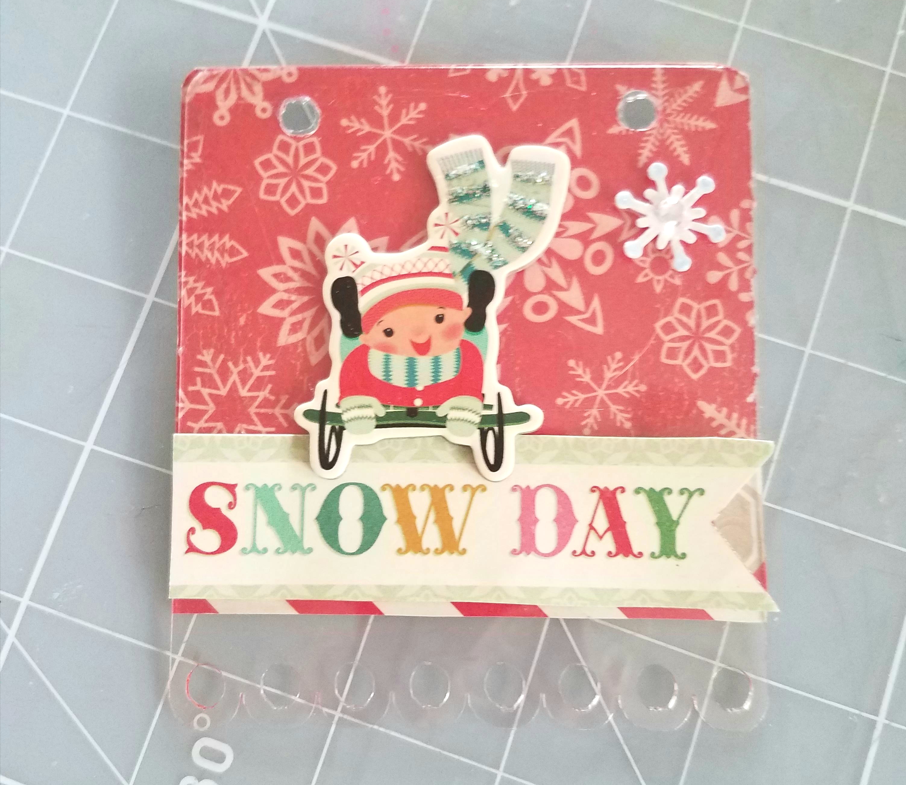 Back side of tag #4: cut paper at 3 & 1/2 x 5 & 1/2 inches and adhered to tag surface. Then I cut a polka dot paper to measure 3 & 1/4 x 5 inches and scored it on the left side at 1/2 inch, attached it evenly on left side of tag. This creates a flip page. You may add a photo inside if you like. To decorate my flip page I added a girl on sled sticker and acouple chipboard embellishment stickers.