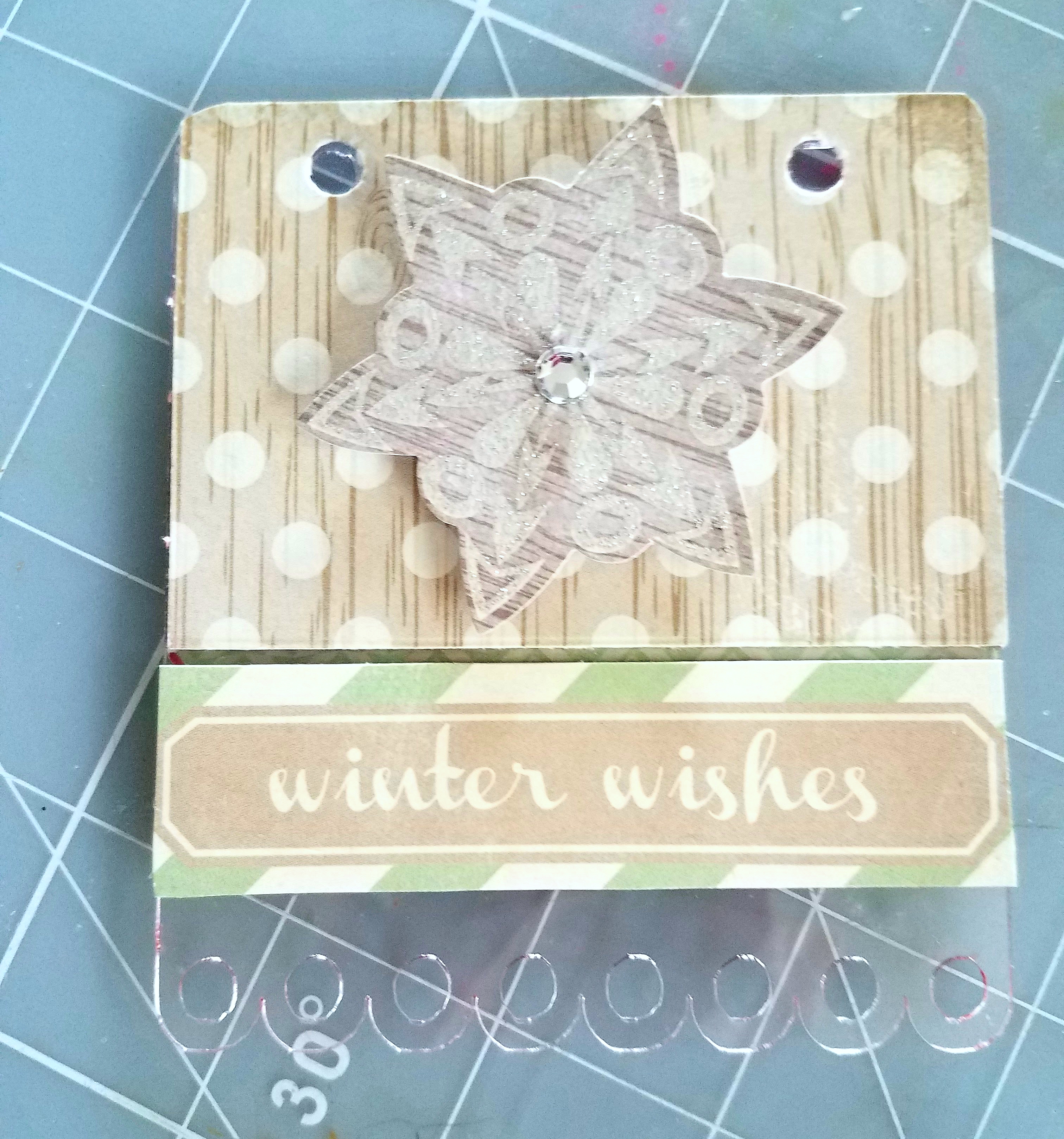 Back of tag #1: I cut another coordinating paper and glued to my acrylic tag. I cut out a sentiment and ahered to the bottom. Added a ephemera snowflake in the middle part of my tag and glued a silver rhinestone in the middle of my snowflake.