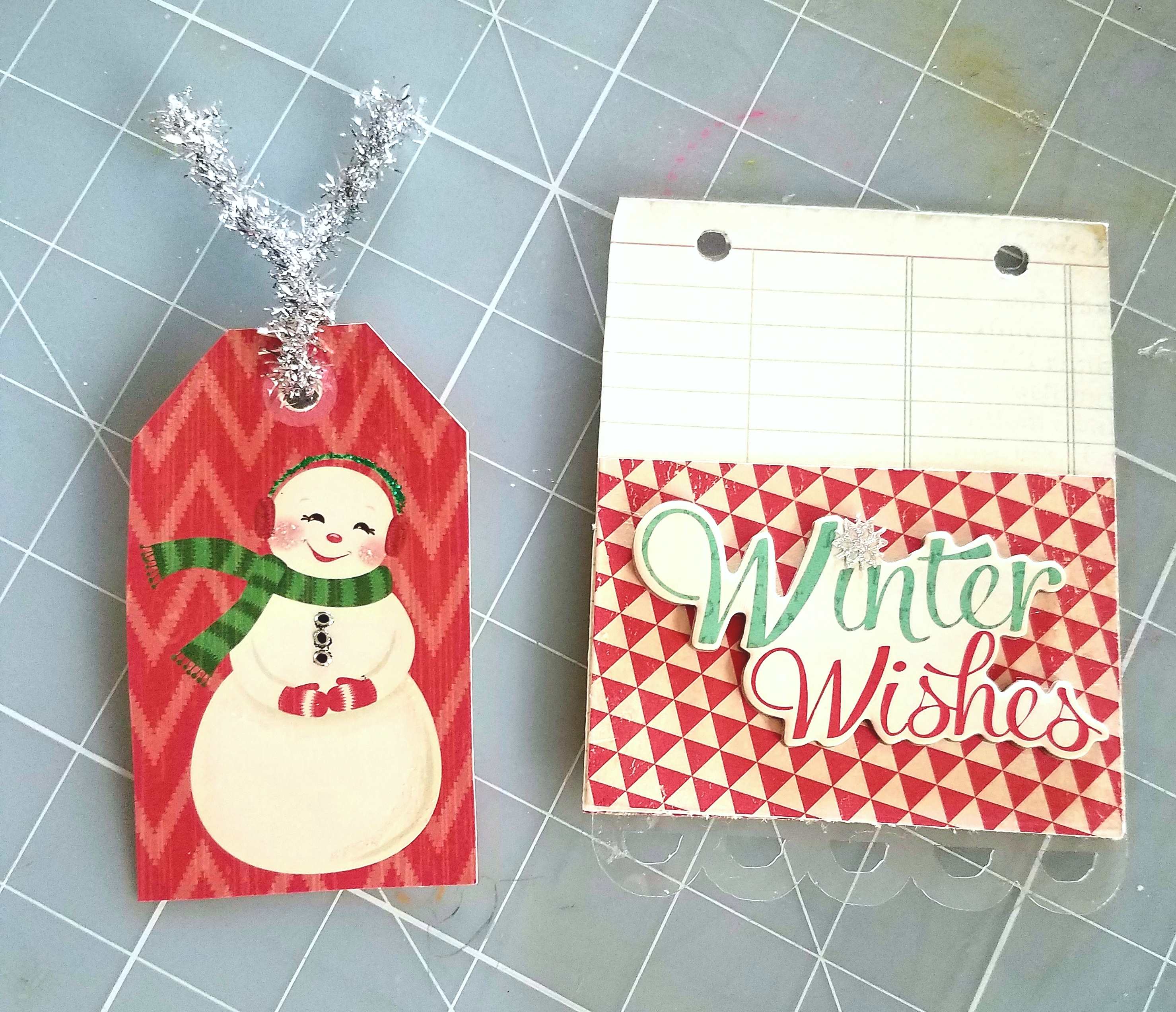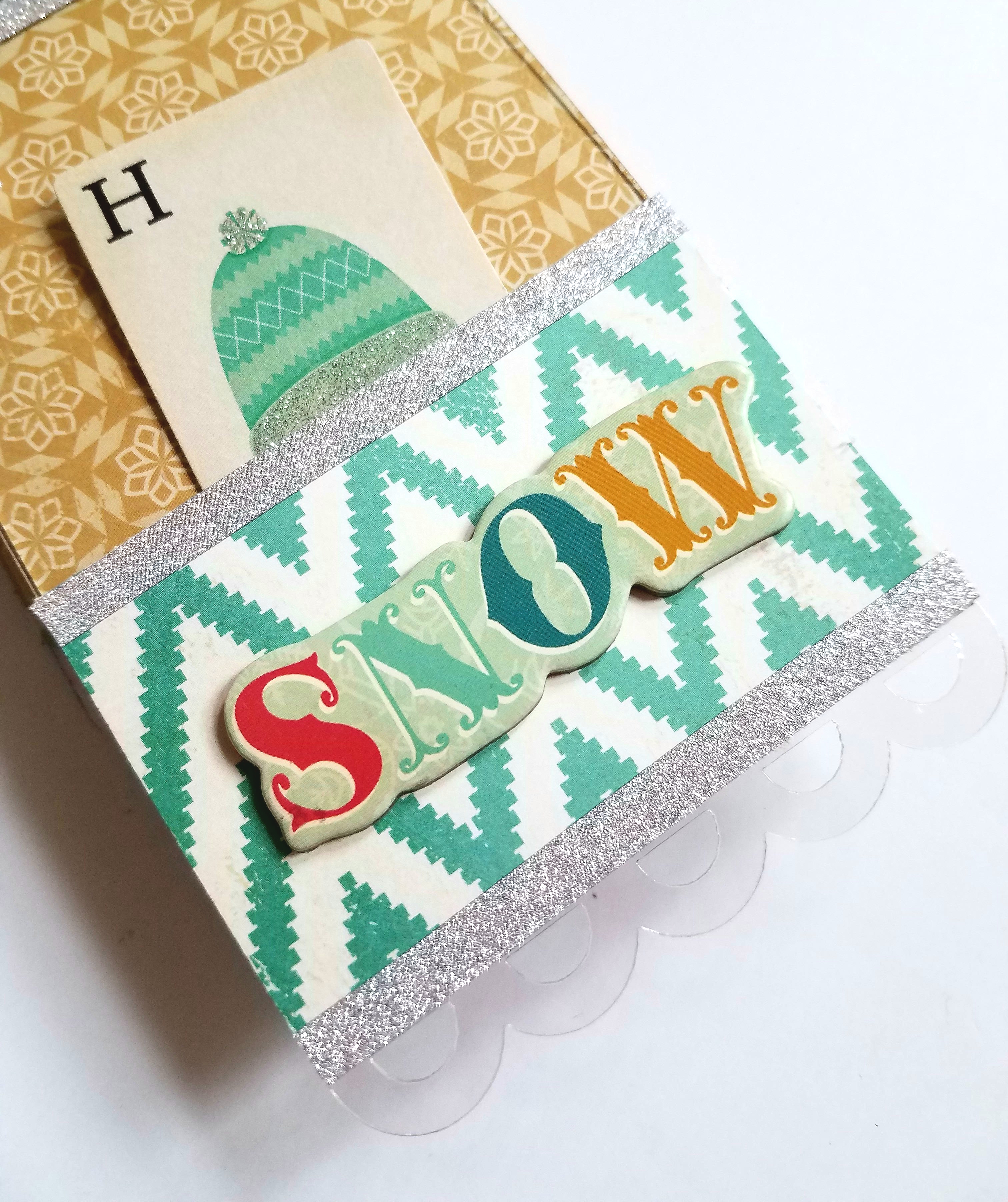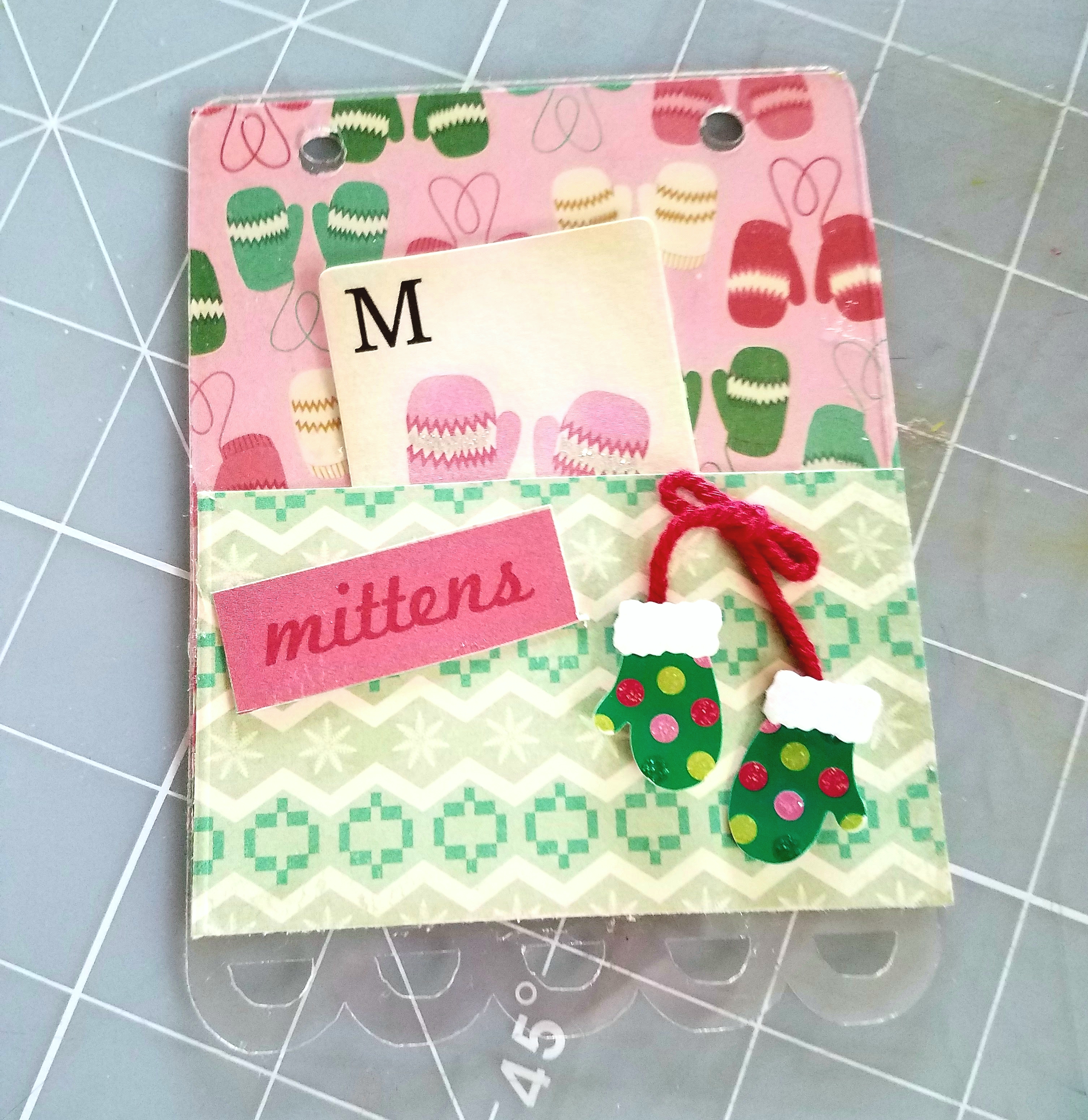 Tag #2: measures at 3 & 1/2 x 4 & 1/4 inches. Adhere your paper to the back side of your tag. Mark and punch holes on top. Then I cut my other paper at 3 & 1/2 x 2 inches and adhered it as a pocket. I added a sentiment sticker and mittens embellishment to the front of my pocket and tucked a mitten ephermera card inside my pocket.