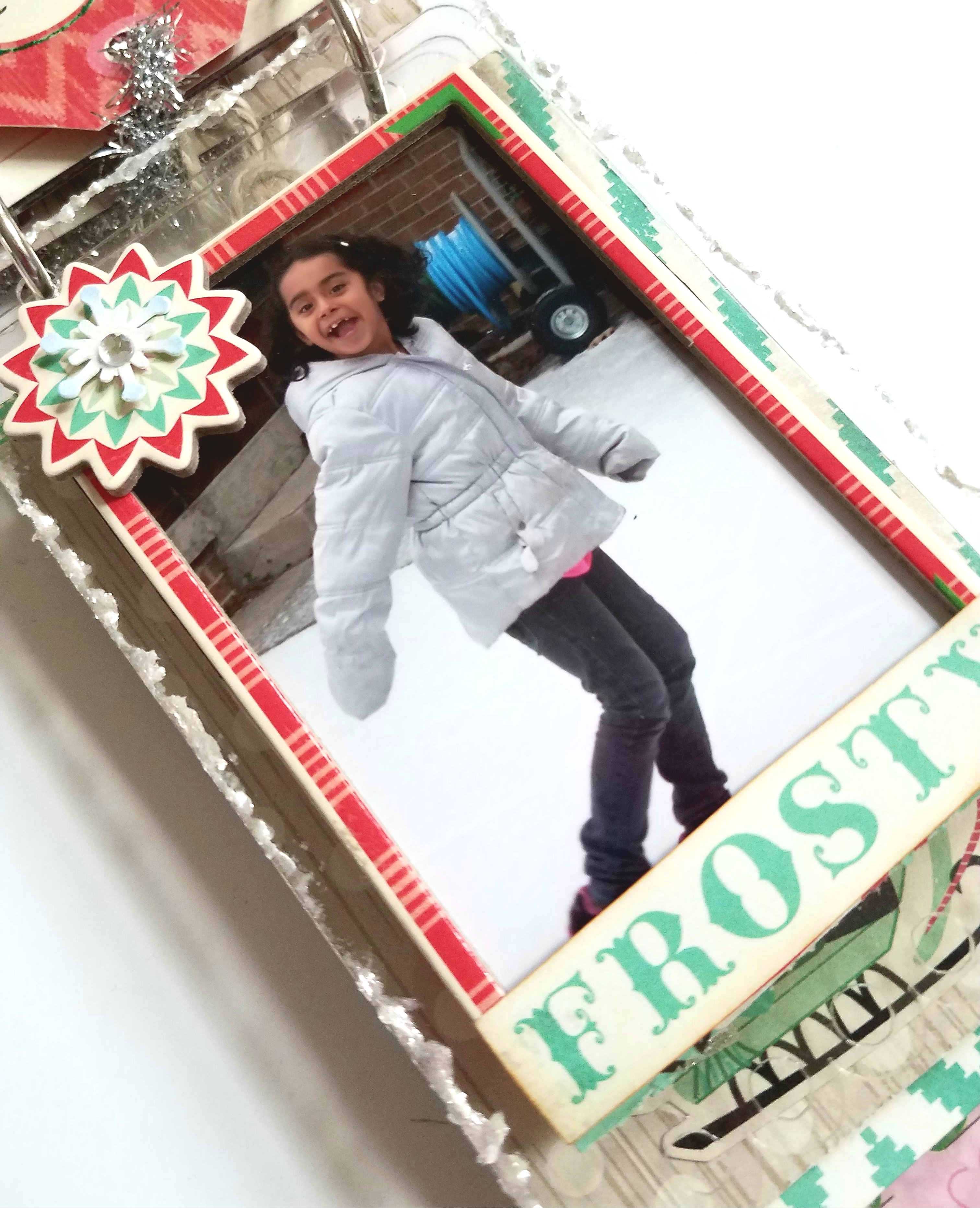 Tag # 3: I chose to add a photo to the back of my chipboard sticker frame. Then glued this onto the center of my acrylic tag. Cut out a sentiment from one of my papers and adhered to the bottom of my photo. Then added a chipboard sticker snowflake to the upper left corner of my photo frame. I took some Luna paste " moonlight pearl" and applied with a small paintbrush tmaround the edge of my acrylic tag. This adds a nice frosty effect. Let dry.