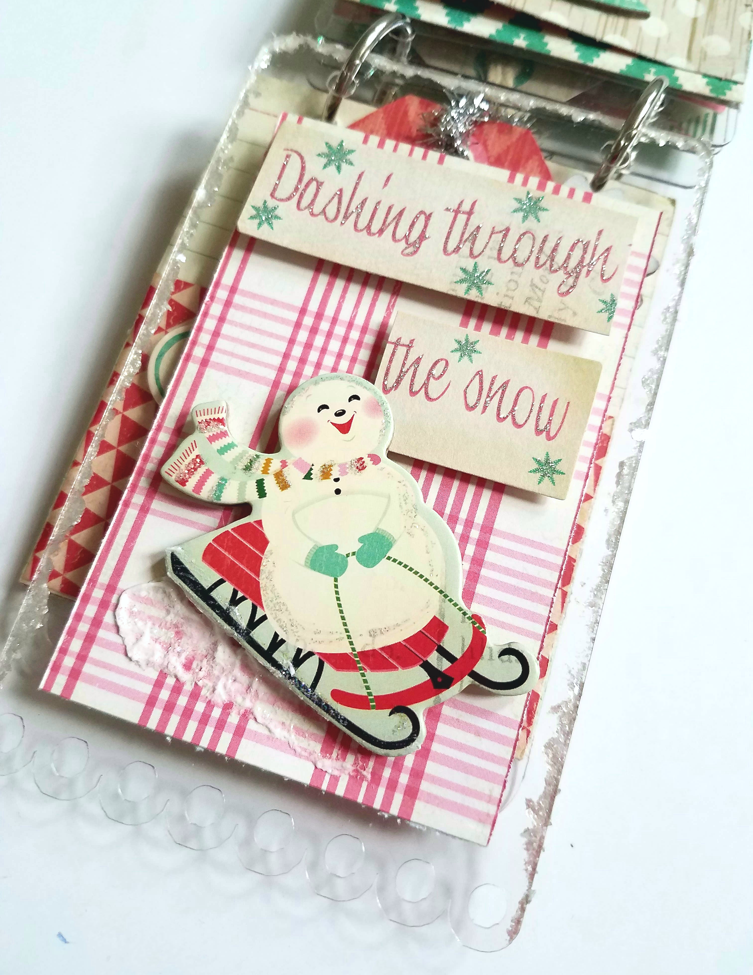 Back of tag #3: I cut my paper to measure 2 & 3/4 x 4 & 1/2 inches. Adhere to your acrylic tag surface. I cut out Dashing through the snow sentiment and added foam dots to the back. Then adhere onto my tag. Glued a jolly snowman on sled chipboard sticker. Added some fake snow to the bottom of my sled and Stickles glitter to my snowman scarf.