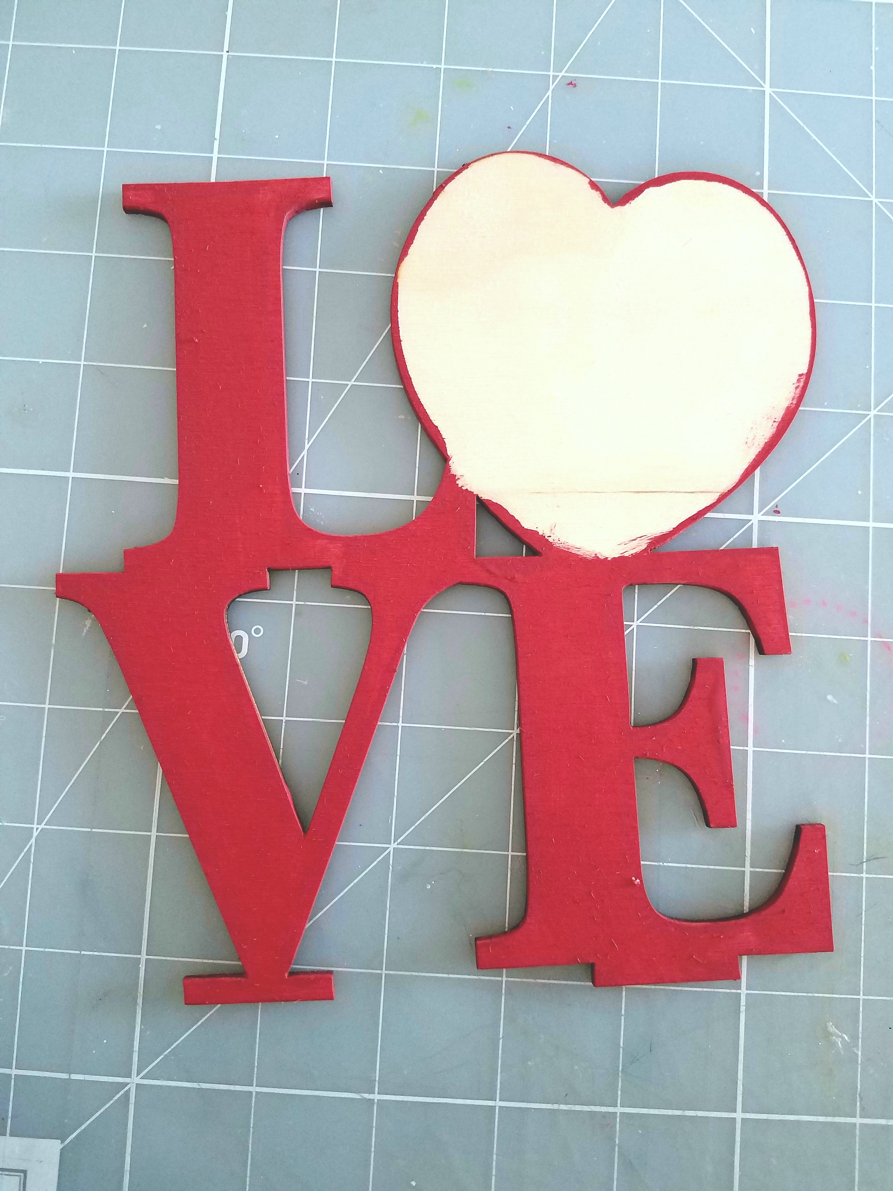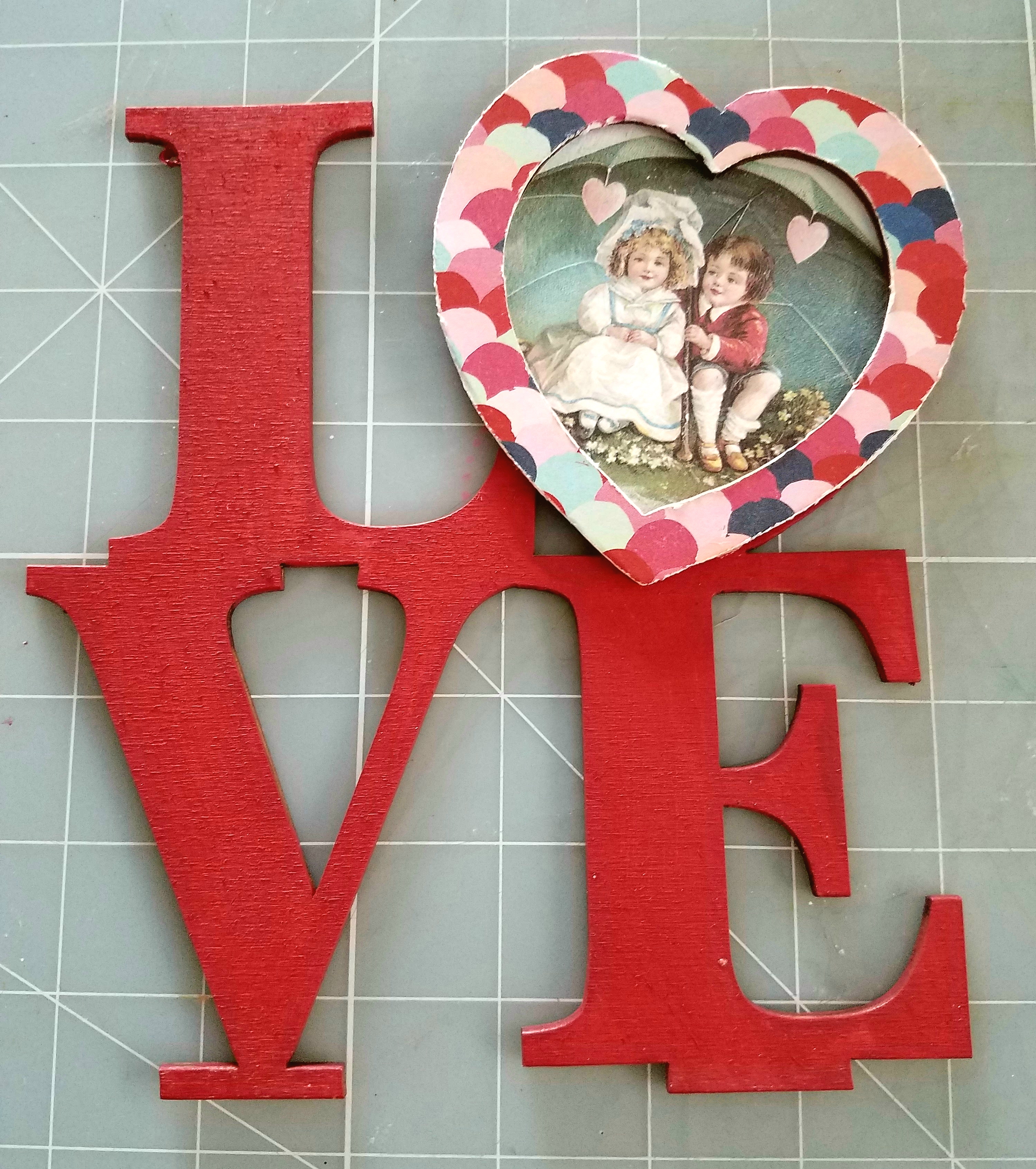 First I took some red acrylic paint and a sponge brush, and painted the Love letters, front, back and around the sides. Let dry. I didn't paint the heart shapes or the two stands, because we will be covering those with papers. But you may paint yours if you like.