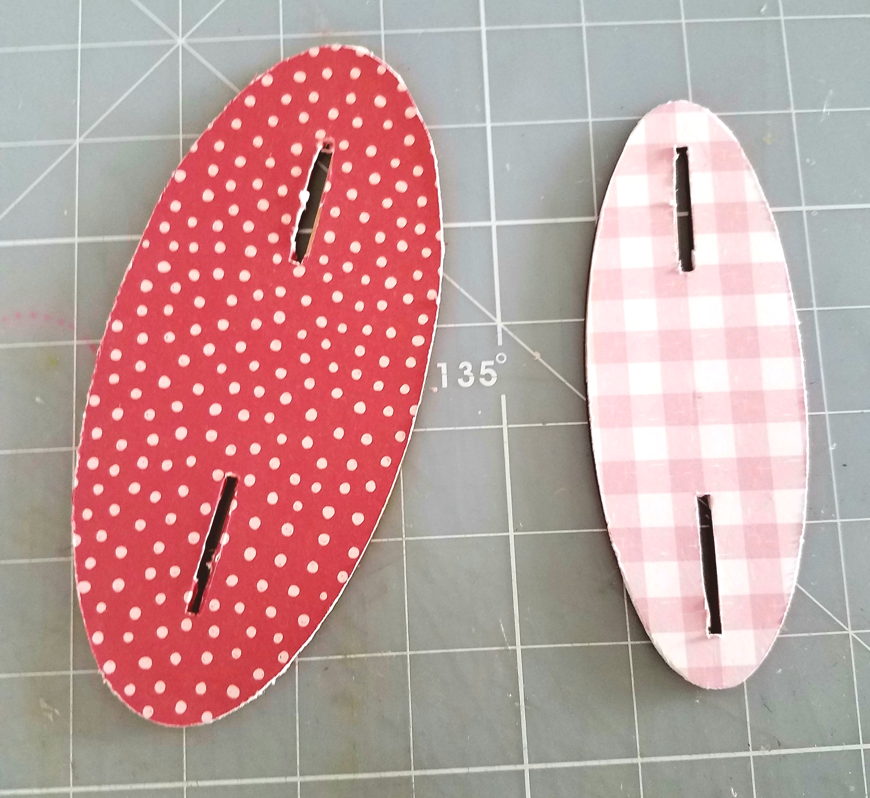 Next I chose two coordinating papers, traced and cut out both shapes. Don't forget to mark where the slots are on each wood base. Glue your papers to each base using Beacon 3 in 1 glue. Trim and distress all your edges. Use an exacto knife to cut a slit where the slots are. Make sure the top part of your frame fits securely into each slot before you glue both base pieces together. It should look like this.