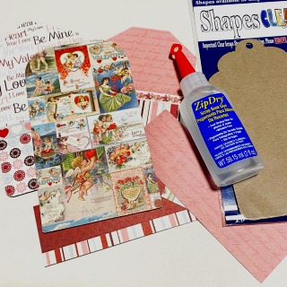 Clear Scraps has lots and lots of fun shaker designs and I enjoy trying to find ways to incorporate them in my crafting. I thought it would be nice to create a Love themed triptych using the Love Mini Shaker and the Chipboard Tag Album. I also like all things vintage and Vintage Valentines are some of my favorite ephemera to collect. I had a paper collection that included vintage valentines in the designs, so I pulled that out to use along with some glitter, glitter gel pens, flowers, ribbons and vintage trims to use on the project.