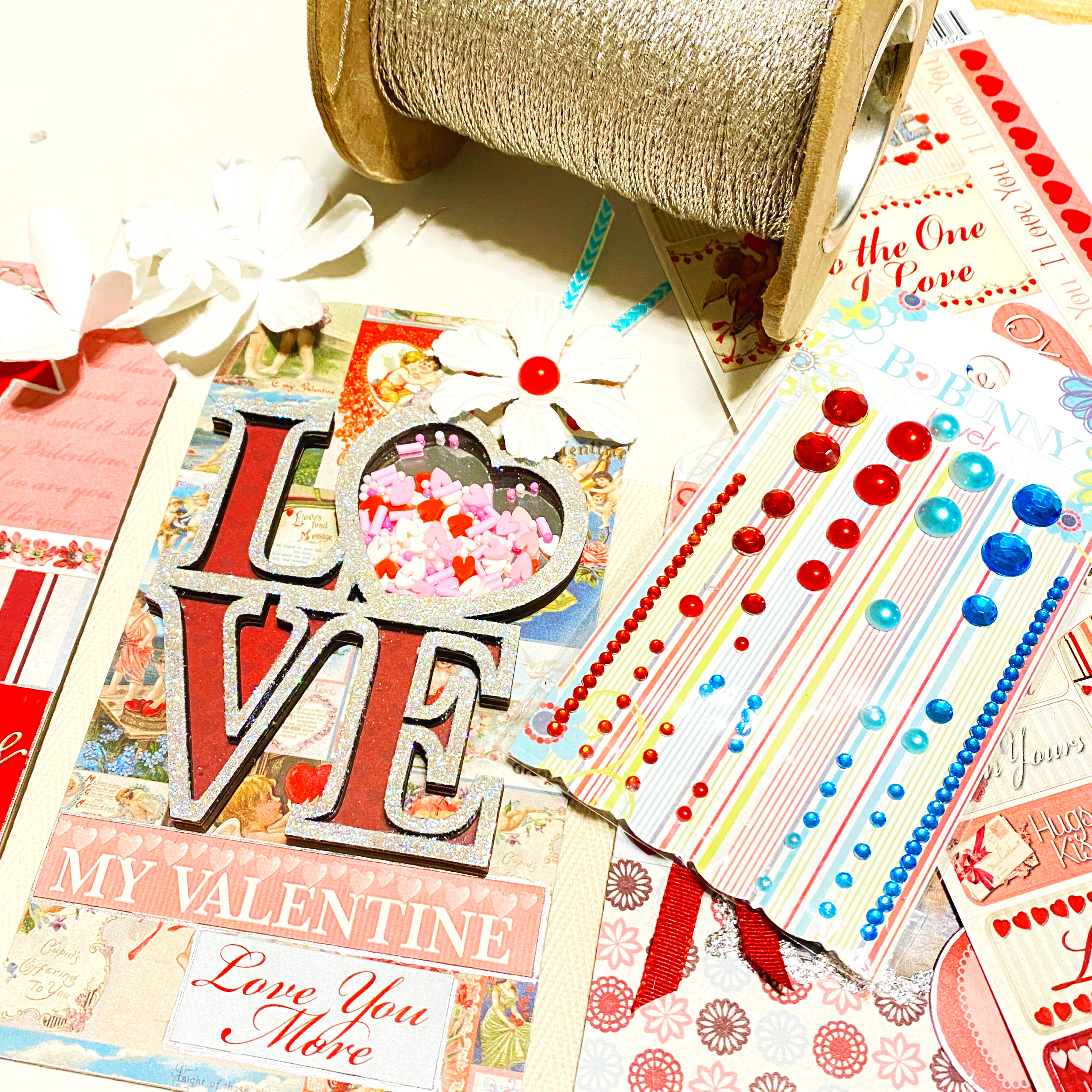 While the shaker dried, I applied a printed paper over the letters on the shaker back piece and a piece of silver foil board to the heart, then glued the other layers of the shaker on top of the back piece…