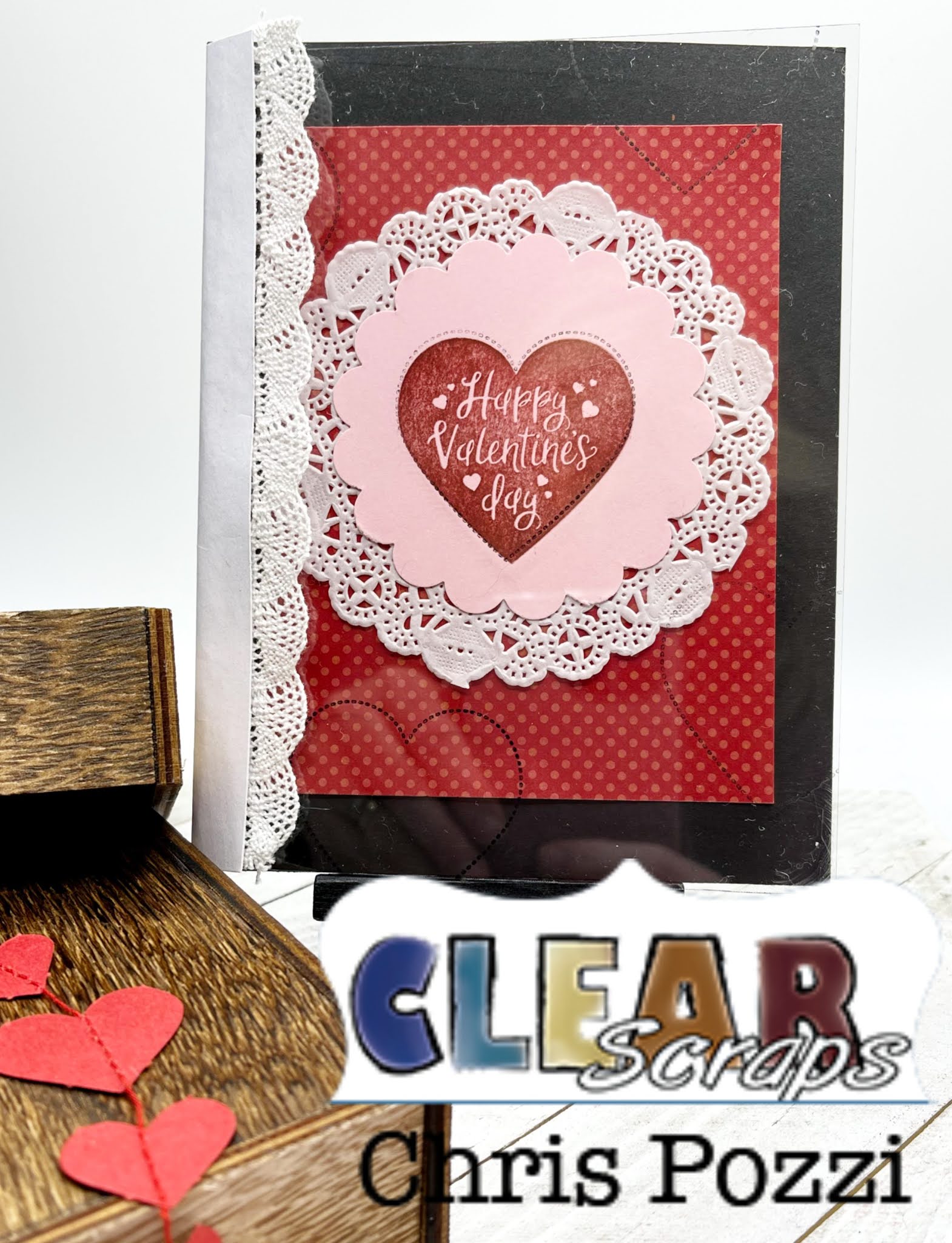 Add a patterned paper block and a stamped heart matted on a a paper doily to finish the inside of your card! I hope you are inspired to try stamping on your Clears Scraps 12 x 12 Acrylic Sheets.