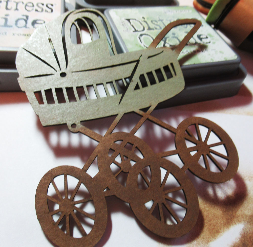 Remove the stroller from it's frame and ink it with distress inks in Bundled Sage and Ground Espresso.