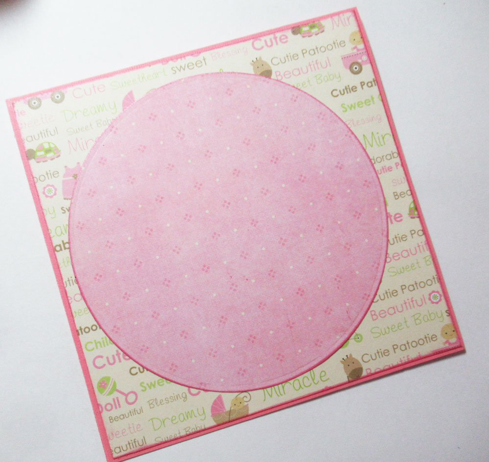 I created a 5 1/2" square card from pink cardstock, then cut baby paper slightly smaller and adhered together.