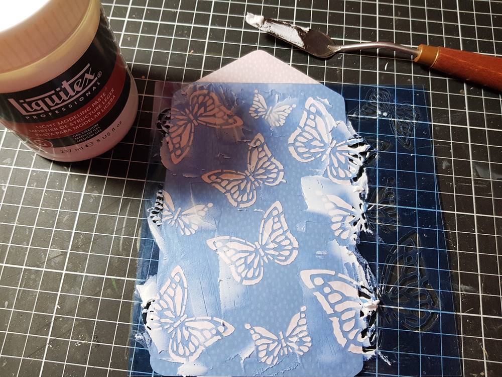 ▼ I decided to give the background some texture by using the stencils along with modeling paste. The stencils I used on these two tags are 6" Monarch Butterfly and 6" Quarterfoil.
