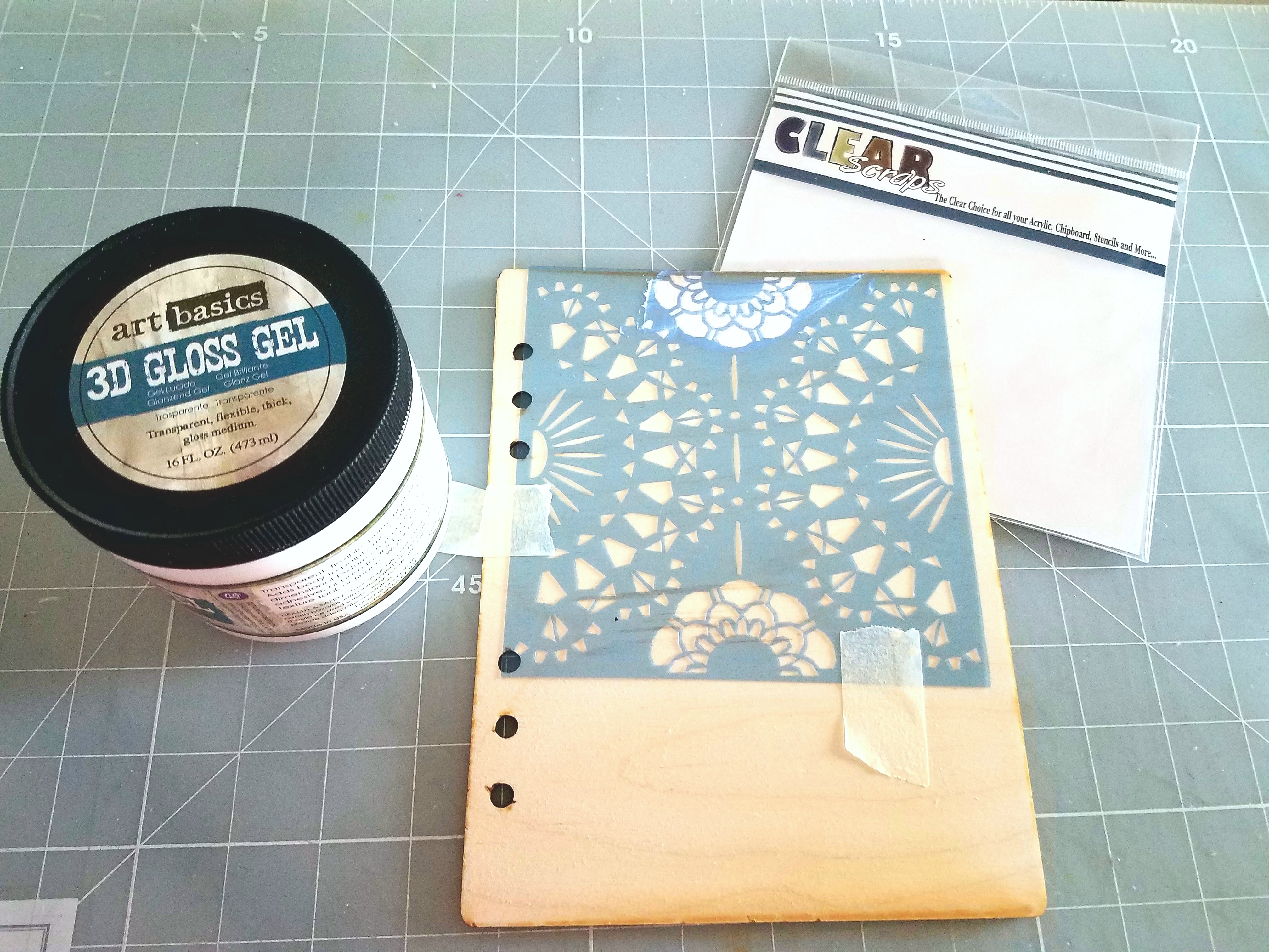 To begin this project, I took my Clear Scraps Doily stencil and using masking tape secured it in place on the top of my album. I chose only to use only a part of this stencil design. Then taking a palette knife and some 3D gloss gel I spread over top of my stencil. Scrape off any excess gel and carefully lift off your stencil. Let dry throughly. To speed up the drying process, you may use your heat tool. Repeat this same process with the stencil, on the bottom and left side of your album cover.