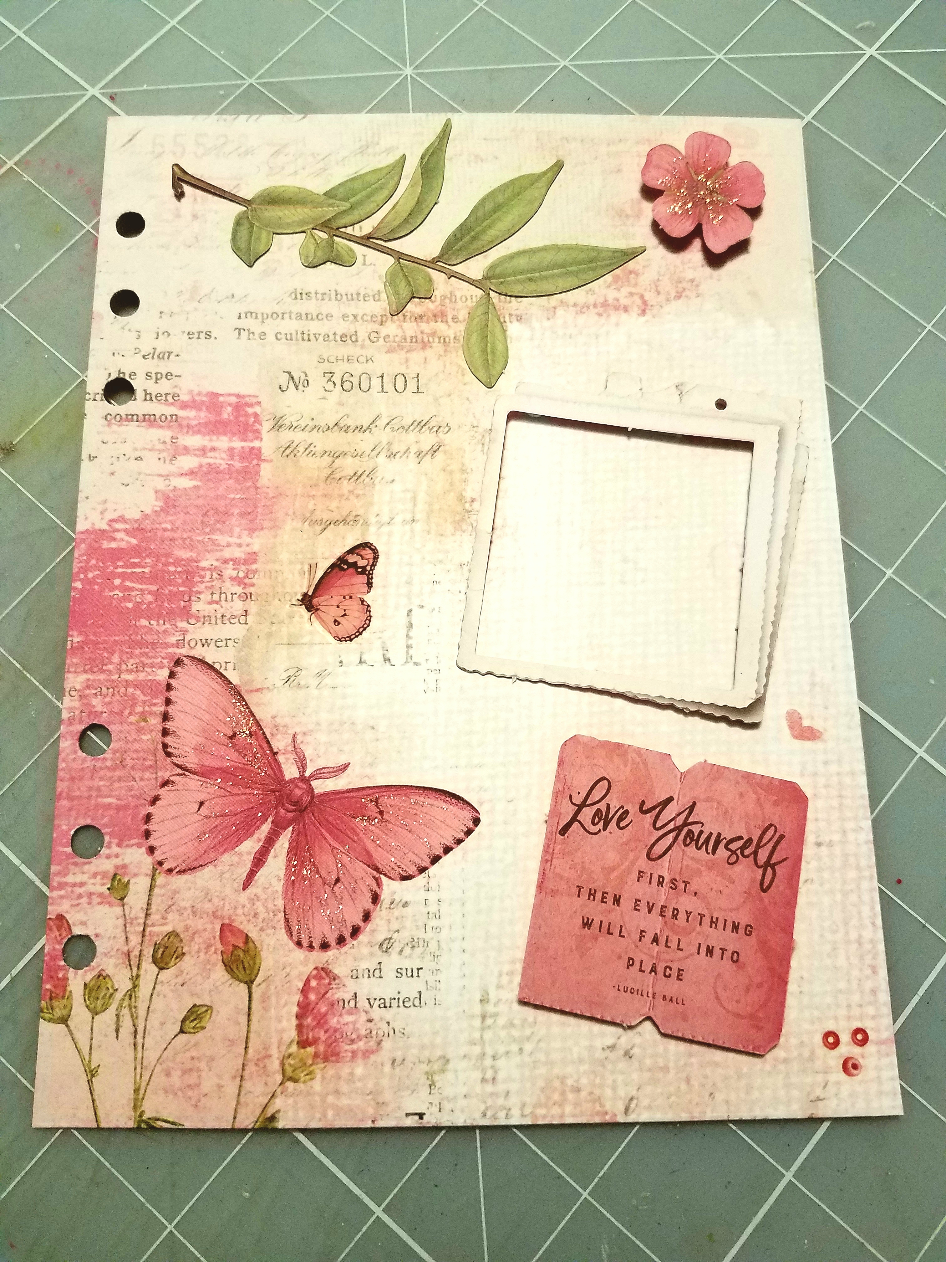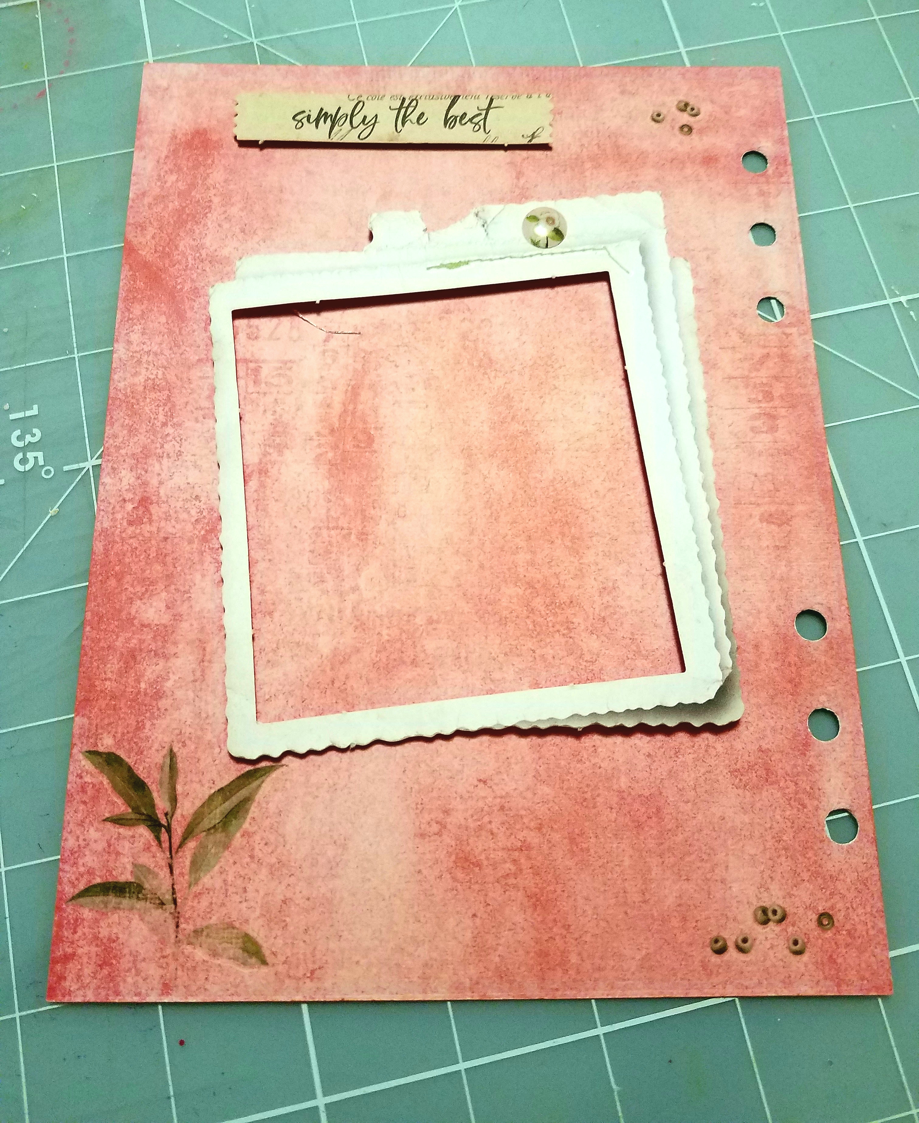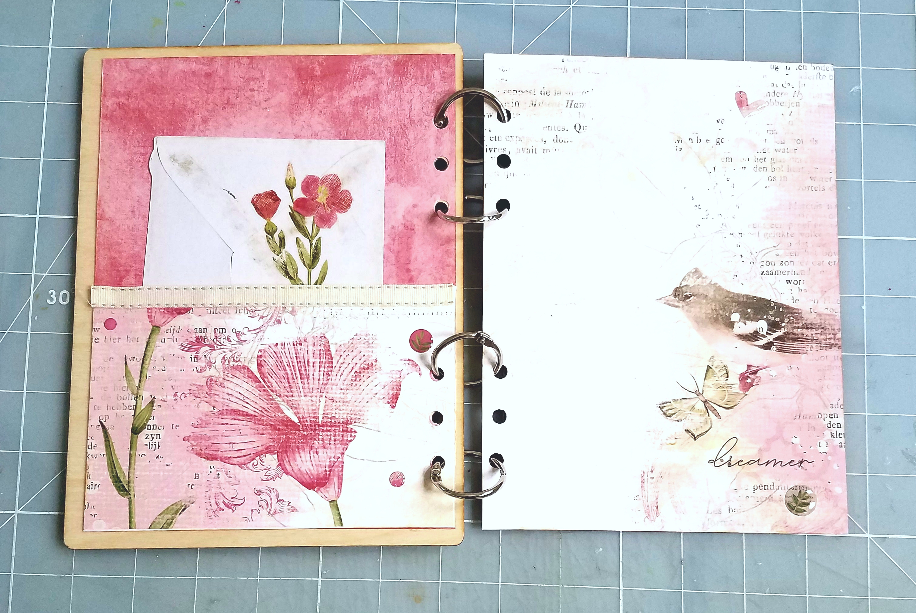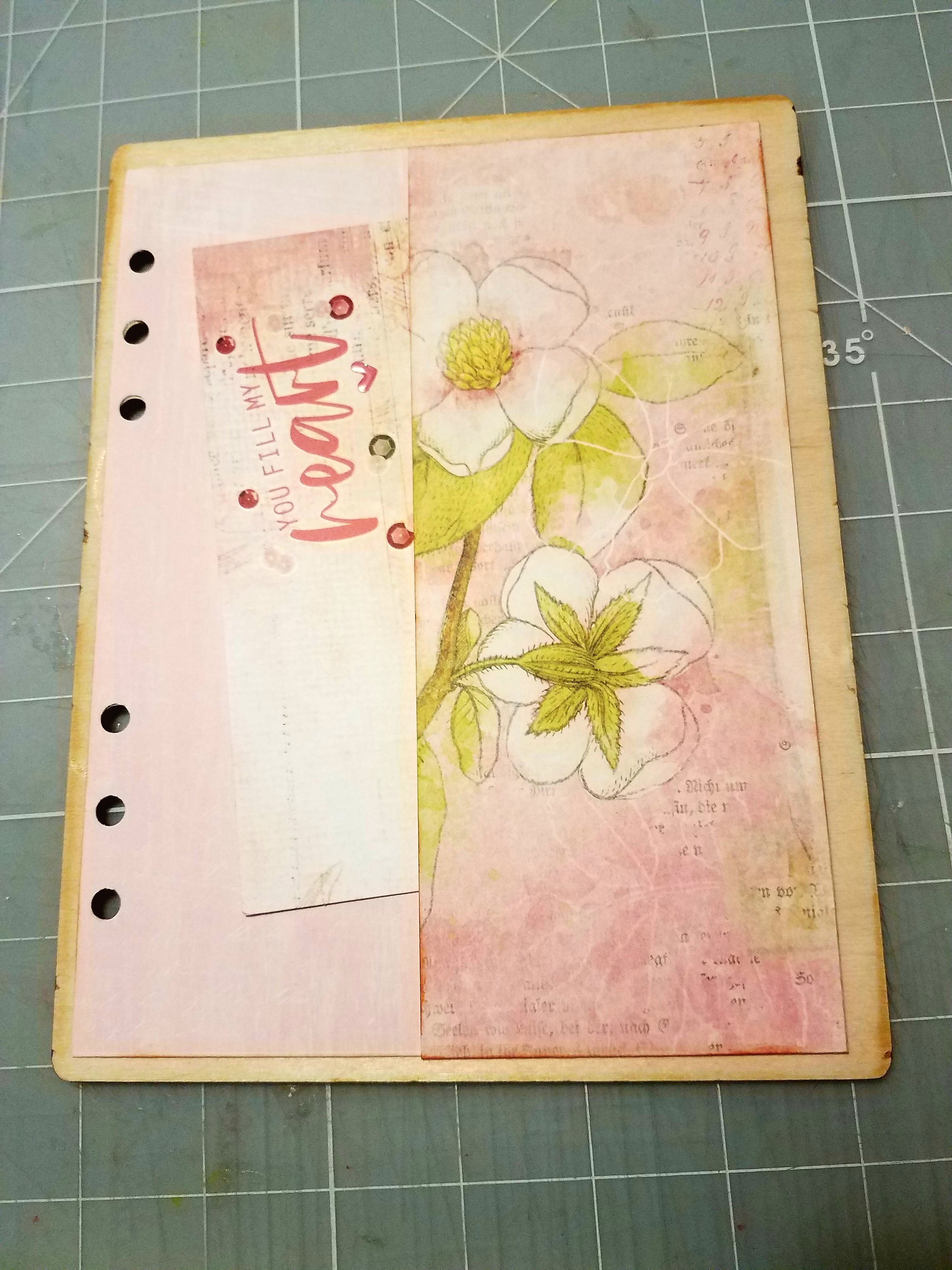 For the inside cover, I cut a 6×4 inch piece of coordinating paper, punched my holes on the right side and adhered as a pocket. Added a piece of trim to the top edge of my pocket. I took one of the ephermera cards and added a floral rub-on to the envelope. Then tucked inside my pocket. For the adjoining page on the right, I cut this paper to measure 6×8, punched holes on the left side, added a rub-on sentiment and some epoxy dots. I left this blank for a photo or some journaling.