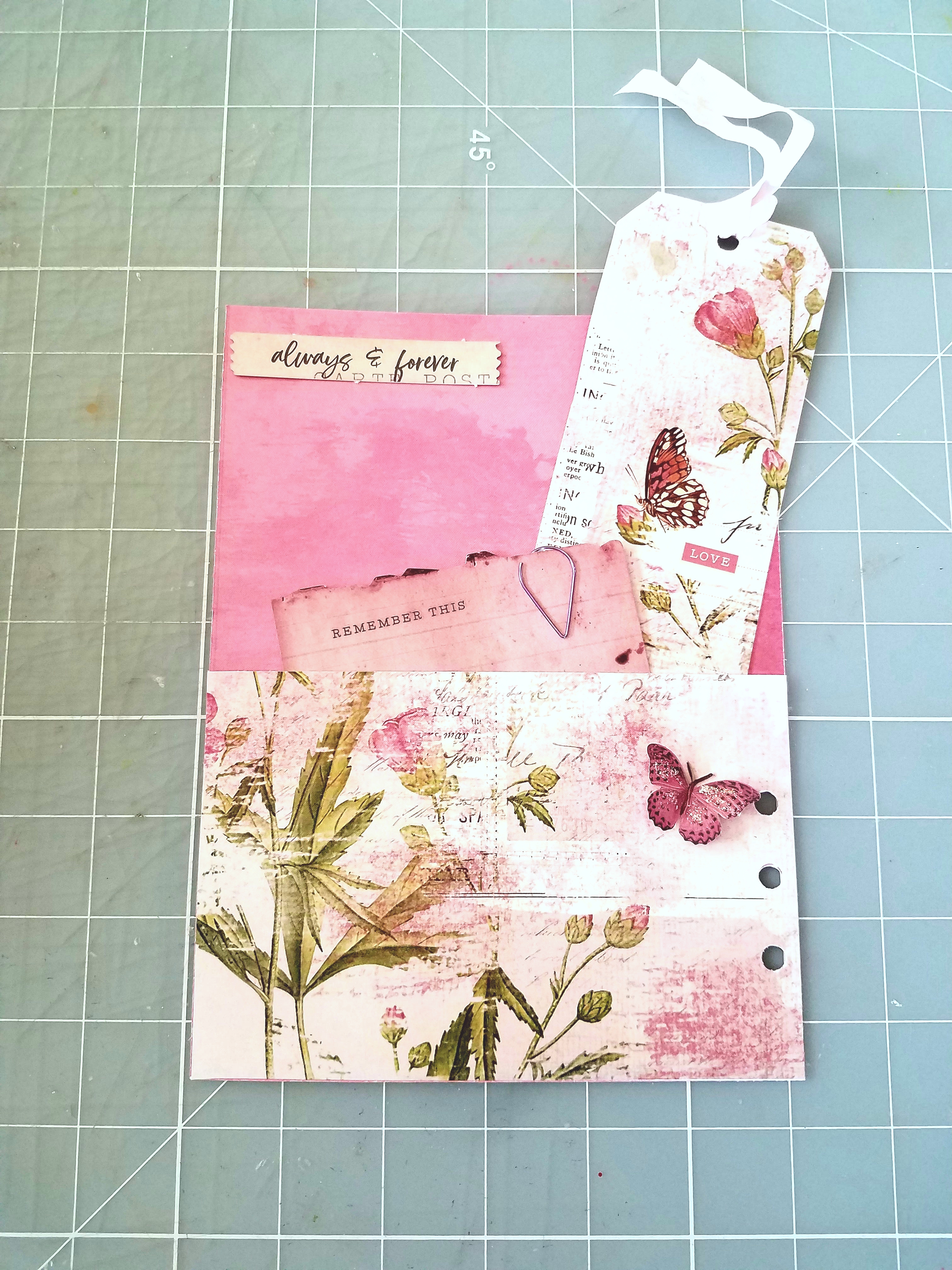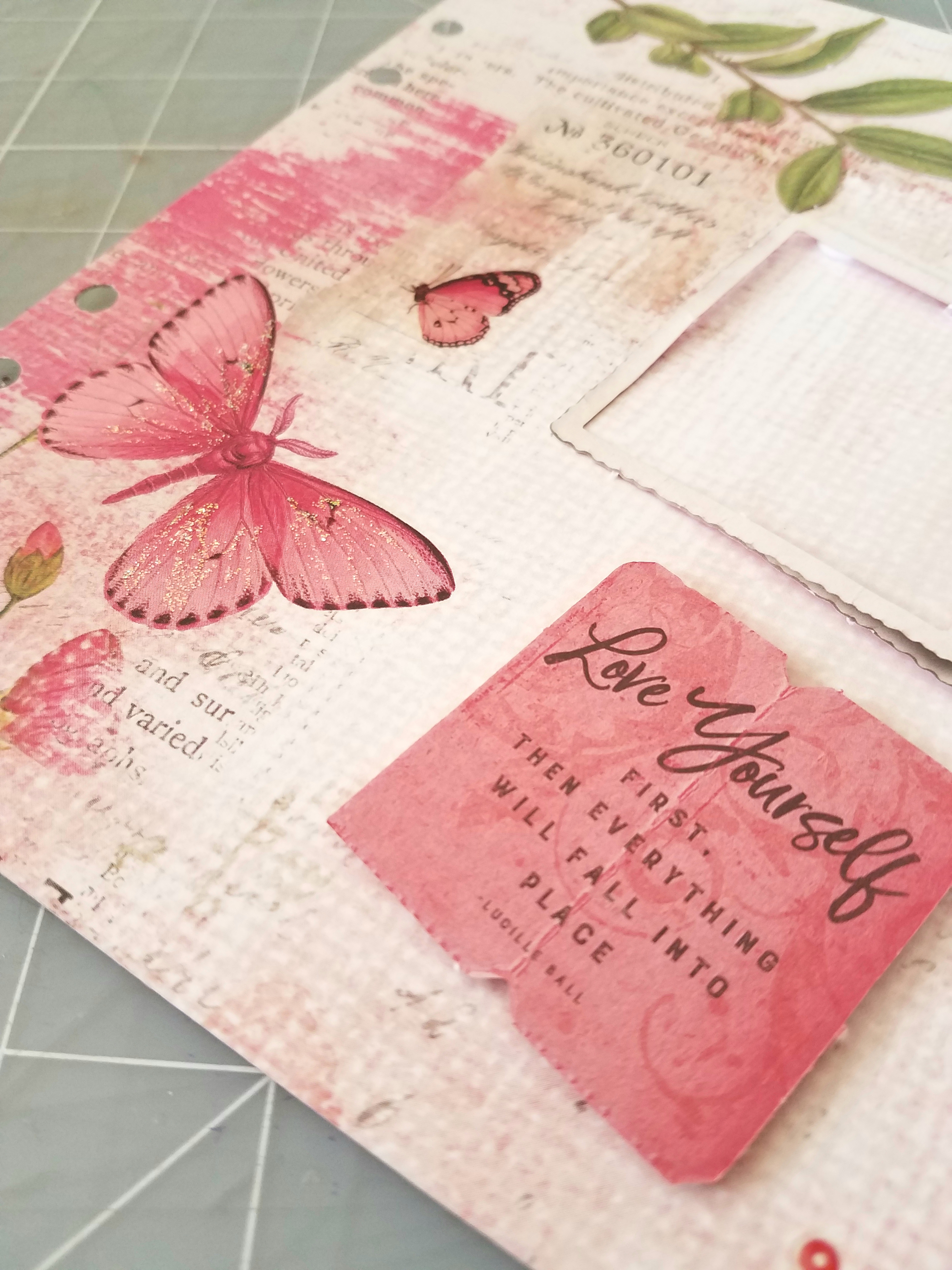 For my last page, I made another 6×8 pocket, added a punch out butterfly on the ride side of my pocket. Added glitter to the butterfly wings. Took a empherma card added a paper clip and rub on sentiment. I made a tag from some leftover paper, punch a hole at the top. Added a rub on sentiment and some tied some seam binding through the hole if my tag. Then adhered another punch out sentiment to the upper left hand corner of my page.
