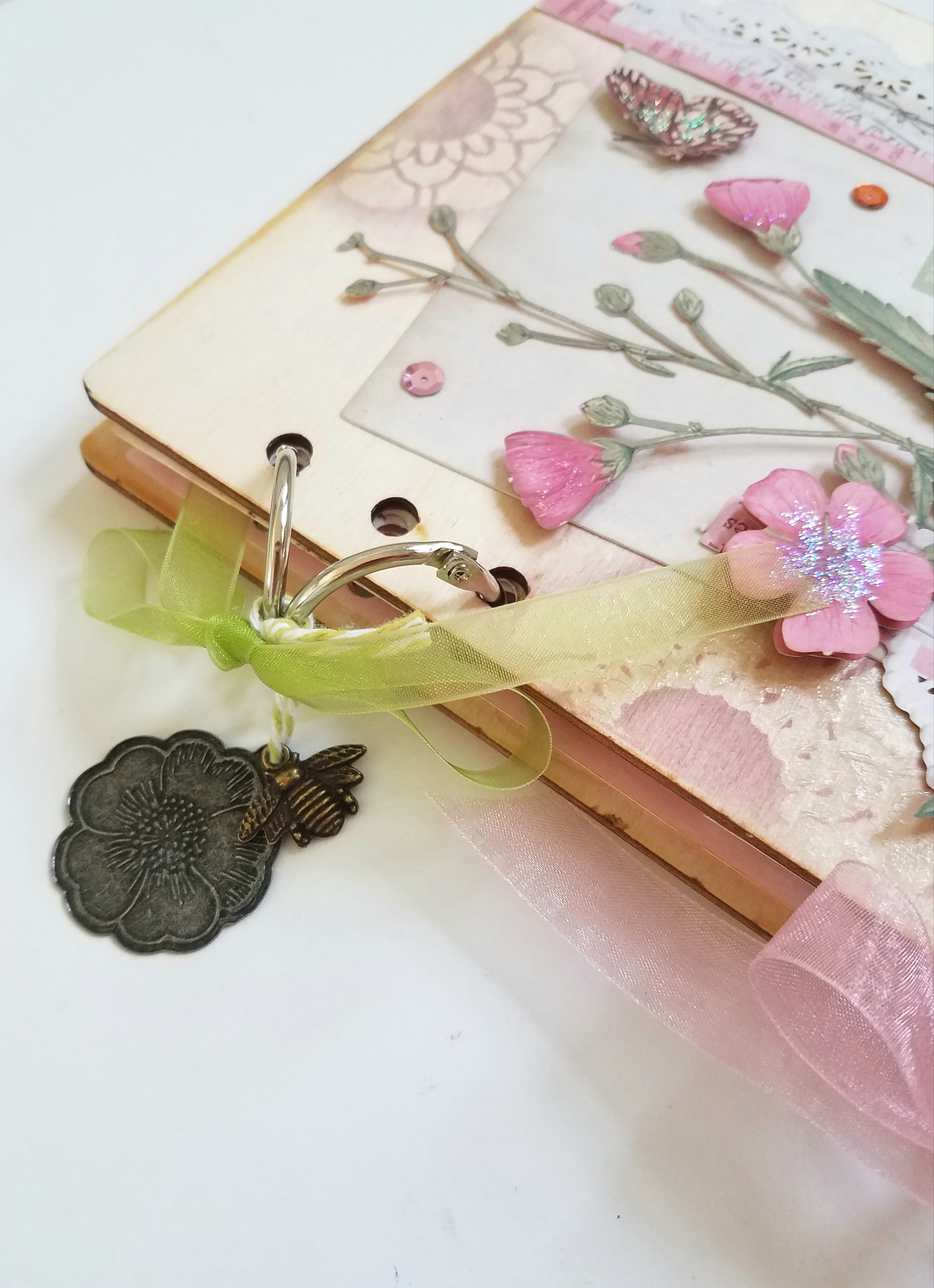 To finish my album, I added a few metal rings and tied some pink and green ribbons into a bow and added some bumble bee/flower charms.
